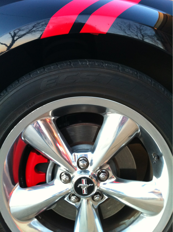 in my stang i have painted them red, but in your pony i would go for black paint. Blue car with red calipers dont match too good for me :P and u have black stripes, so black calipers could be the best option. That's my humble opinion, now u chosse