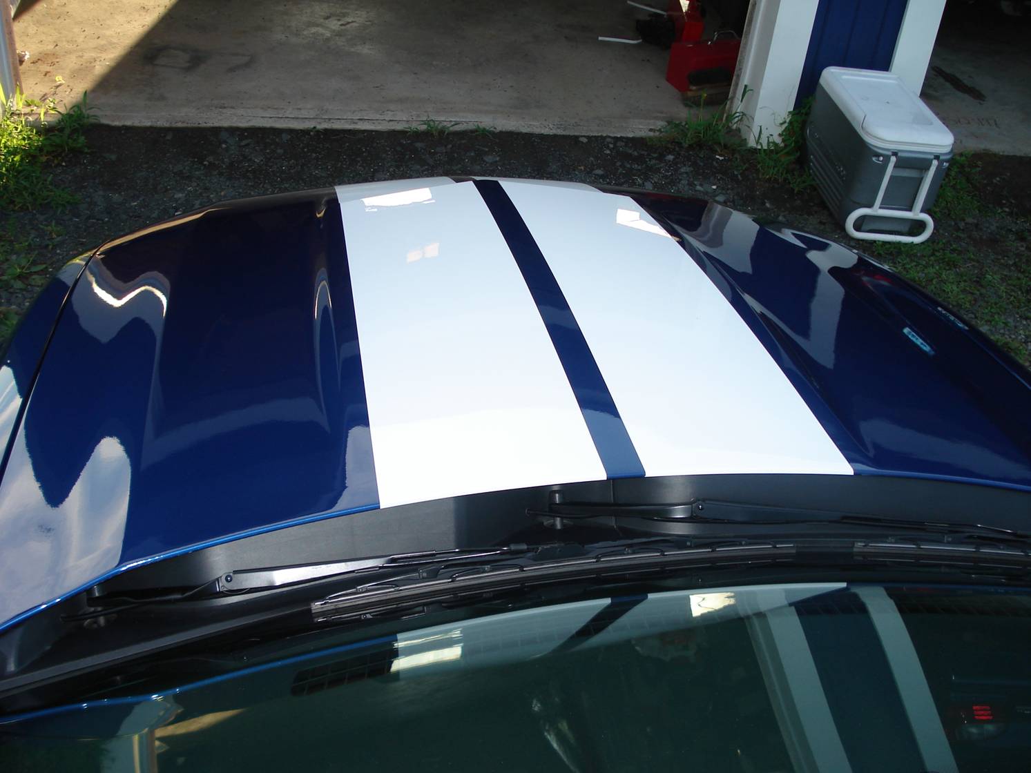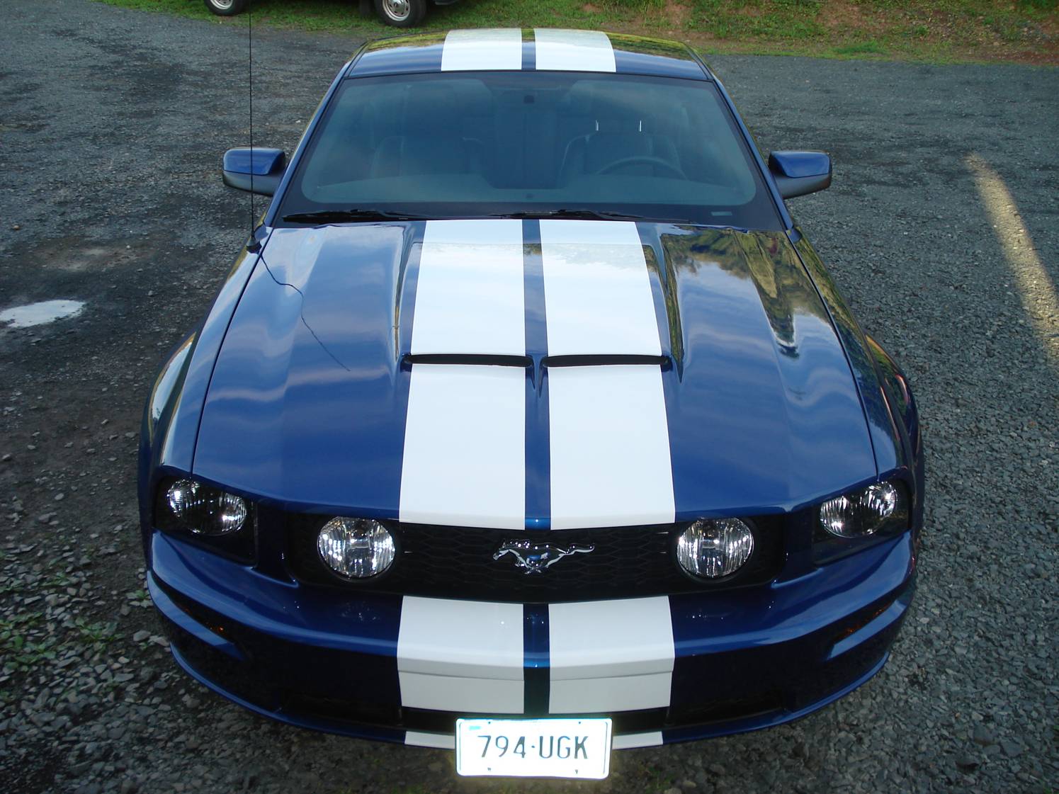 I have the Vista Blue car with the authentic Shelby dimensioned stripes. Check out my sig for a link to more pics. I will have to get a pic that mimics what Stangnut is alluding to.