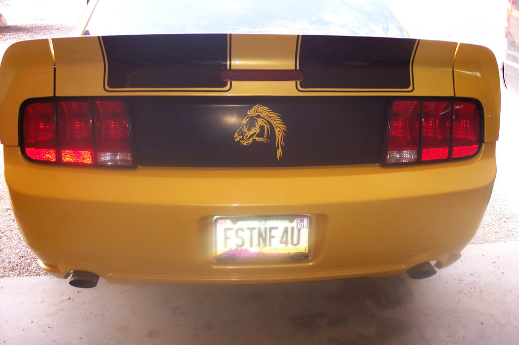 I have two suggestions. First, black out the horse on the grill. Second, get a set of Moss/AVS tail-light covers and paint them black. It really helps tie the blacked-out rearend in better. Here's how mine looks....