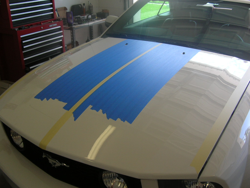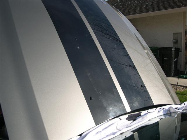 the shaker I think will not cover your back two holes....if that is them where the blue tape is? because I think the shaker will only go where your square is under the hood?