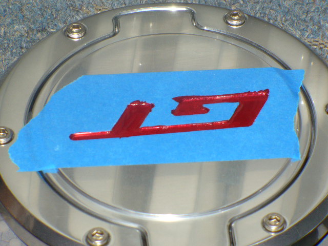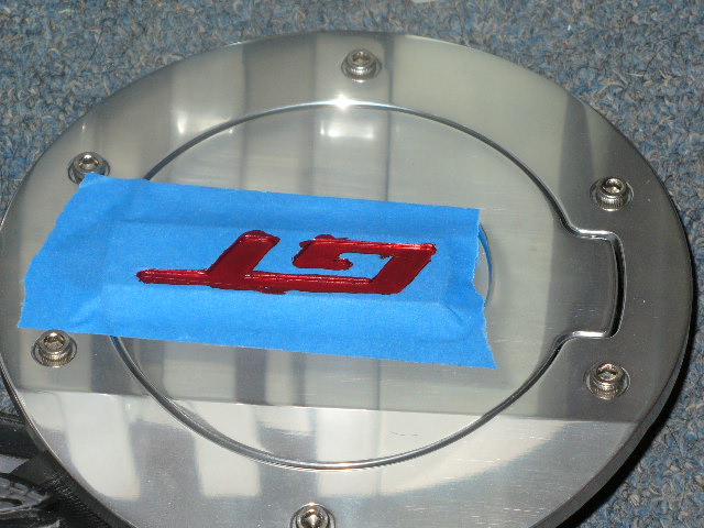 Well first I am painting the gt insert areas on both the fuel door and the rear medallion the metallic redfire. I think I am going to have to put on a few coats, so I may not finish install today. We will see what time of drying is needed between coats. I have them tilted next to a heater so trying to keep them warm. I am using blue painters tape. I covered the area. then slightly rubbed over the lettering to get the indentation areas. I then used a brand new utility knife blade to slowly cut the area out that I wanted to paint. Just take your time if you end up doing this. I am trying to make sure the insert area gets painted nicely. So take your time. Can't wait to throw them on. will have more pics later today.