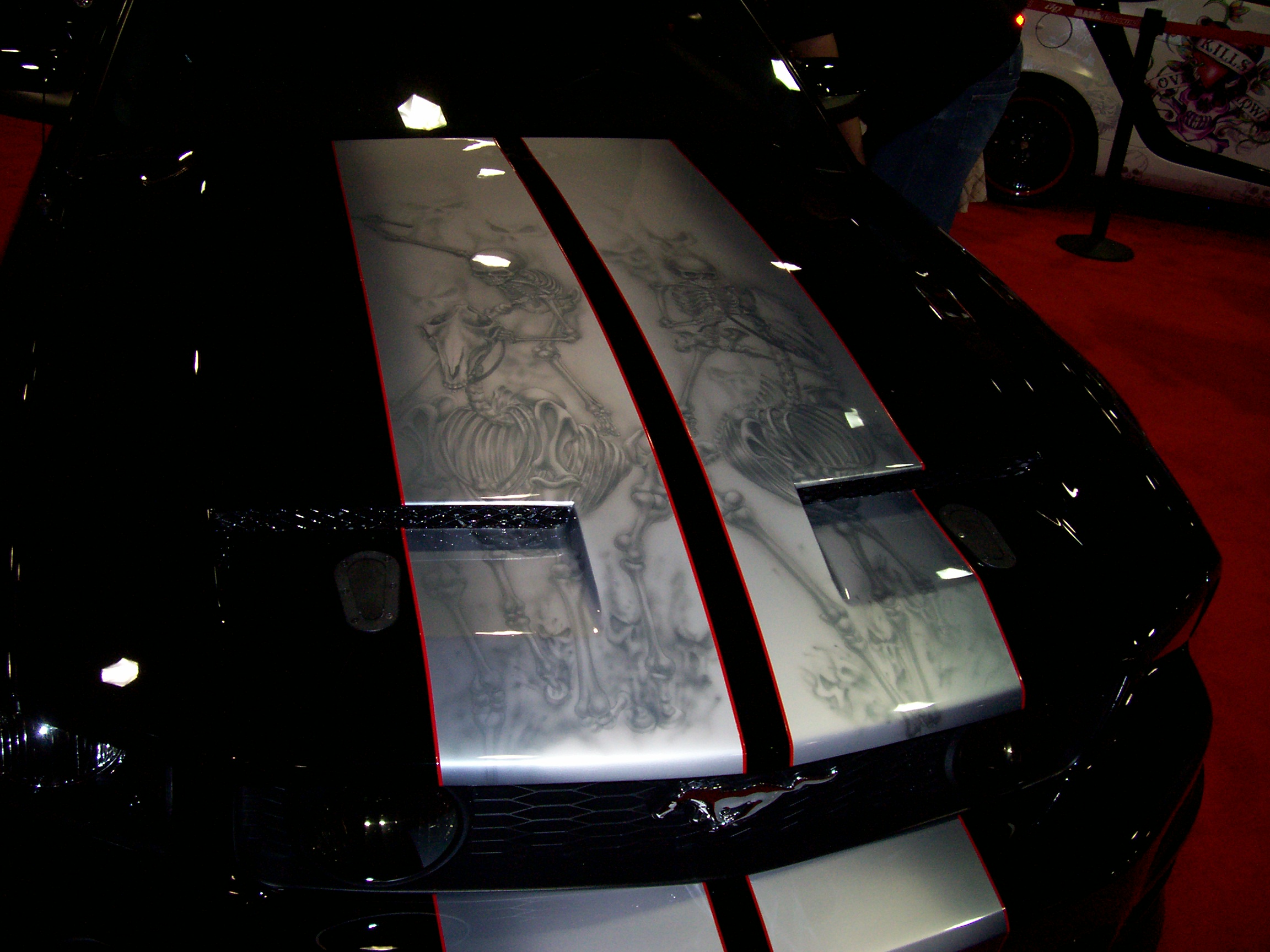 What I like is the skeletons appear to be Horses. I love the hood. I have those stripes on my stock hood, but never thought about mixing the two. I think I would space the stripes to meet the air ducts and take them over the fenders ala Foose.