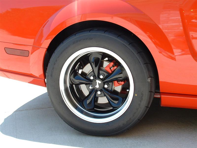 I had a 2000 V6 with cobra rims (275/40/17's) and the rolling resistance was a little much (but nothing a little more power can't make up for). But, when I sold the car and put back some factory parts, and factory 245 series wheels/tires, the car seemed just as quick.