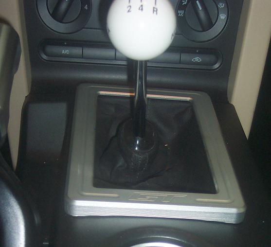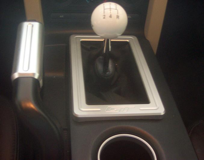 Oh man that looks sweet! Good match with the e-brake too (I have the same one). How does it mount, tape or snap? It look like the one FLAstangx3 got doesn't have the edge effect I saw on the auto shifter (it looks straight). Is that just the picture or is that an option? Either way it looks sweet!