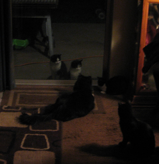 Using a Laser Pointer I Got To Play With The Feral Kittens While Our Resident Cats Looked On! It Was O Dark 30! They Will Scatter if I Open The Door But Don't Run Far or Stay Away as Long as They Used To! Notice It's 2 Of Our Tuxedo's Watching! Must Be a Clan Thing! They Are Cousins at The Very Least!