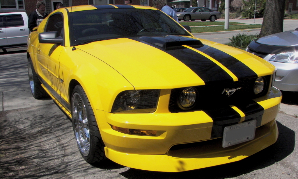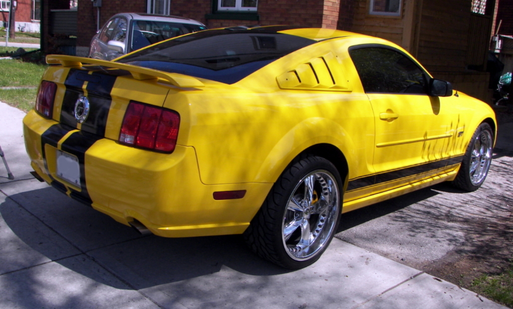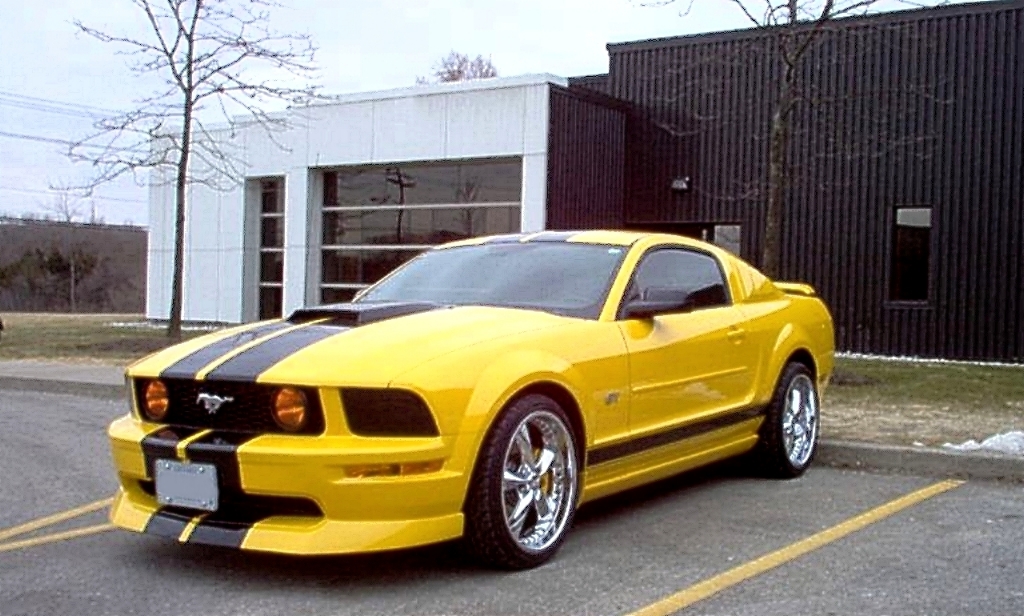 l got a 2005 Screaming yellow GT. The guy l bought it from had customized it nicely. With a CDC Chin spoiler,Black vinyl stripes,sequential tail lights,Roush hood scoop,Roush side window louvers. And some sweet Rims 20x8.5 on the front and 20x10 on the back Foose nitrous chromes. Topped off with B.F. Goodrich G force TA KDW 285/30 ZR20 back and front 245/35 ZR20. I tell ya with these rims and tires it sticks to the road like glue! He stored it every winter and never took it out in the rain. Plus it only had 18,000km on it. It really was like brand new. It's good to have a mustang again