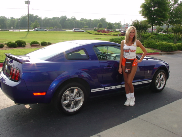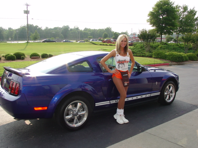 Here's my Sonic Blue Mustang with chrome 17"s on them with BF KDWs with my good friend Holly.