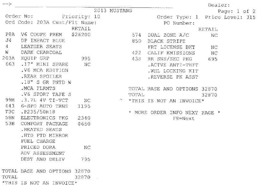 Just a clarification, what you posted wasn't a DORA (dealer order receipt acknowledgement). It's a VOC (Vehicle Order Confirmation). VOC is what the dealer sees at the time they key in an order to the order banks. DORA is what Ford sends back to the dealer a day or two later acknowledging that they received the order.