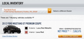 I purchased a 2010 GT Convertible from Ted Britt in Fairfax about a week ago. I didn't see a Lava Red coupe there, maybe because I was blinded by the Grabber Blue of the convertible I bought.