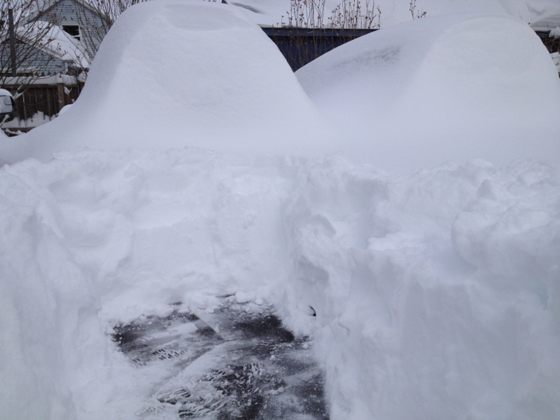 We got around 3 feet of snow in northern CT from the storm. Here's a picture of my Mustang before and after on Saturday afternoon. Even with clearing it off three times on Friday, it still got buried.