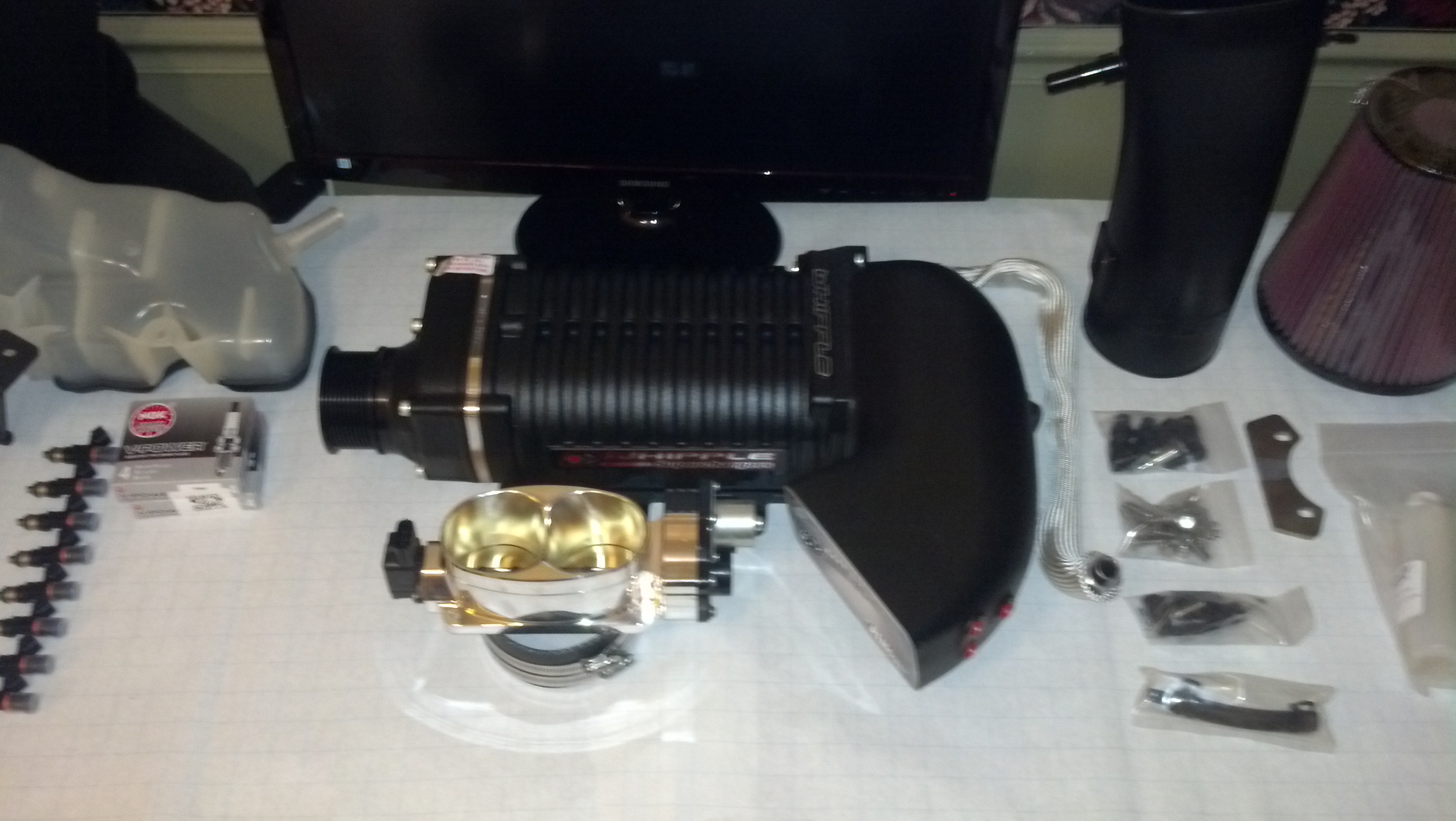 Well almost there, got the 2.9 Whipple in with a minor change. Lethal said they were getting a metric crap ton of complaints with the mono-blade so the kit has been updated with the 65mm dual-blade t-body. Lund Racing said the same thing, go with the 65mm dual blade which flows around 1500 cfm and that would make it good for about 900hp (1518 cfm / 1.67 cfm per hp) which "should" be enough to get the car to 700 rwhp guestimating the parasitic loss due to the blower and drivetrain provided it actually takes around 100hp to make 18 pounds of boost and the drivetrain holds steady at 15% (as that seems to be a reliable figure for the TR6060, stock final gear and stock driveshaft) and while Lethal says with 72 lbs/hr injectors fuel mods aren't required Lund Racing recommended a BAP as well including a better H/E and 170 t-stat before I bolt on the blower.