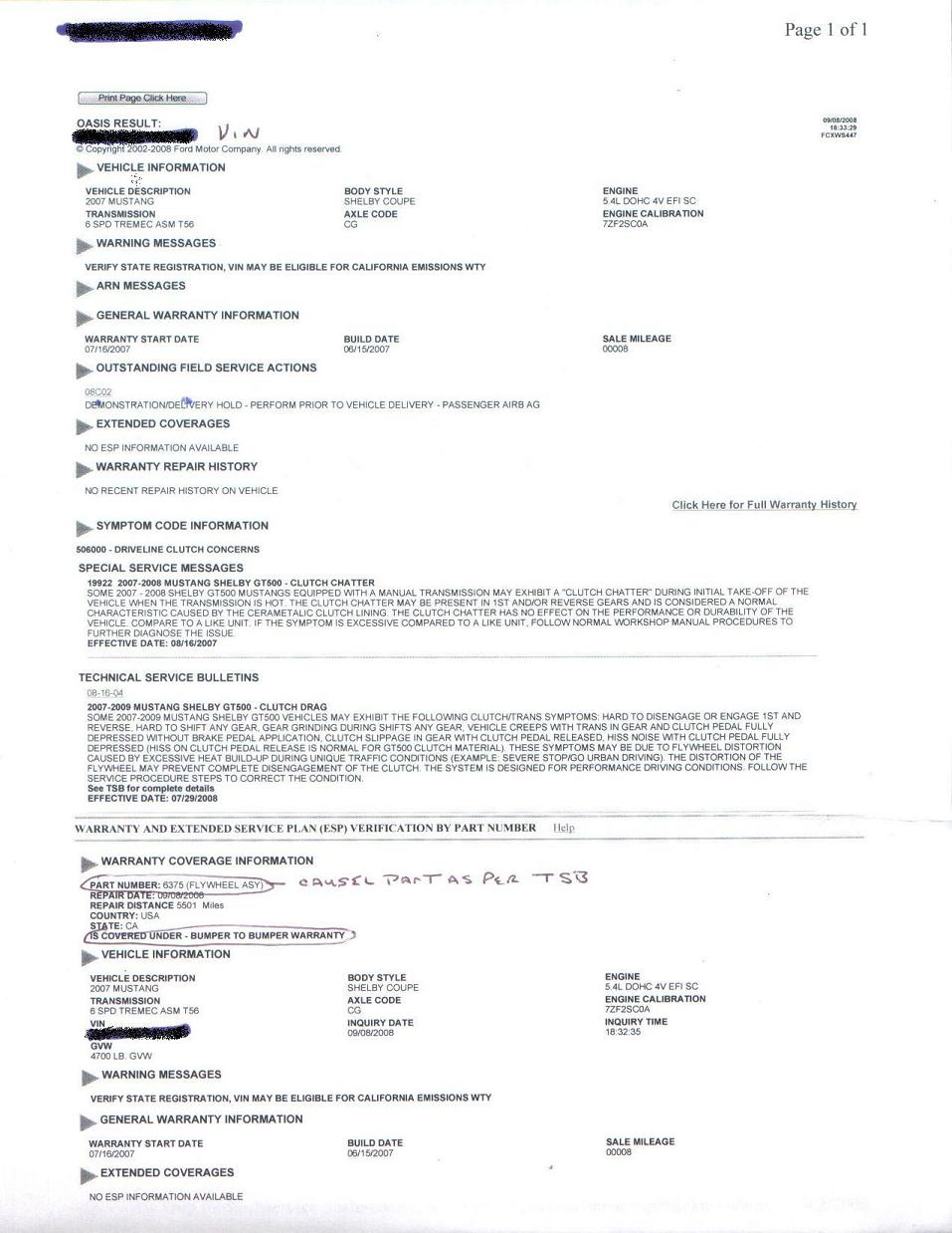 Just an FYI GT-500 Owners. If you Have any of these Clutch or Transmission Problems Best to get it done before the Warranty is up! Do not Snooze! If you Read between the Lines it pretty much {implies} the GT-500 Clutch is not for Continuous Stop and Go Traffic. In fact I know of a Local Dealers Wife who Ran a Gt-500 through a Long Parade and Fried the Clutch. I am Not trying to make anybody paranoid but simply want to inform. I took all the Part Numbers Listed on the TSB and With Labor Total Cost for this is 5 to 6 k at your Local Dealer Depending on Parts Mark up and Labor Rate. Be Advised!