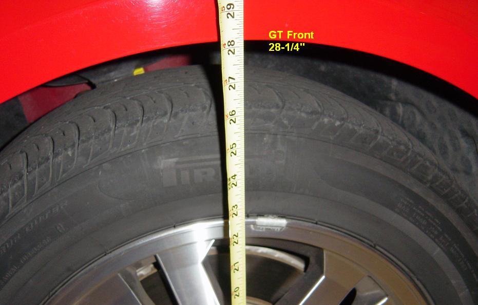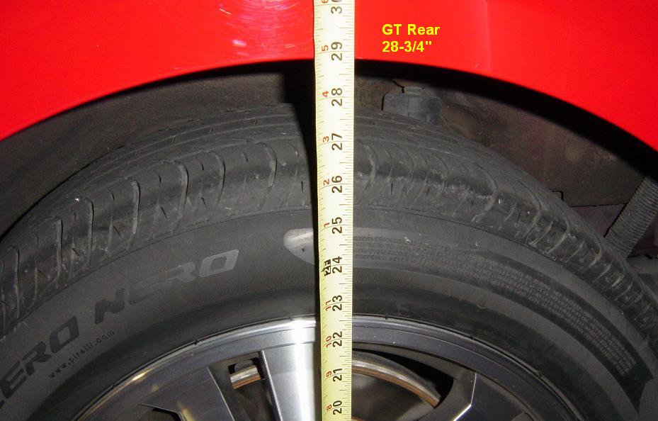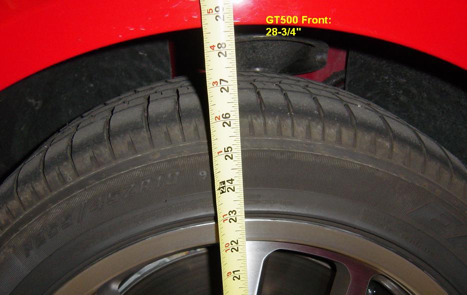 Very true but the tire height on both (three if you count the different tire sizes on the GT500) are ~27.1 inches. This makes the distance between the center of the hub to the top of the tire the same on all three. Therefore, the difference in the wheel diameter does not affect the ride height.