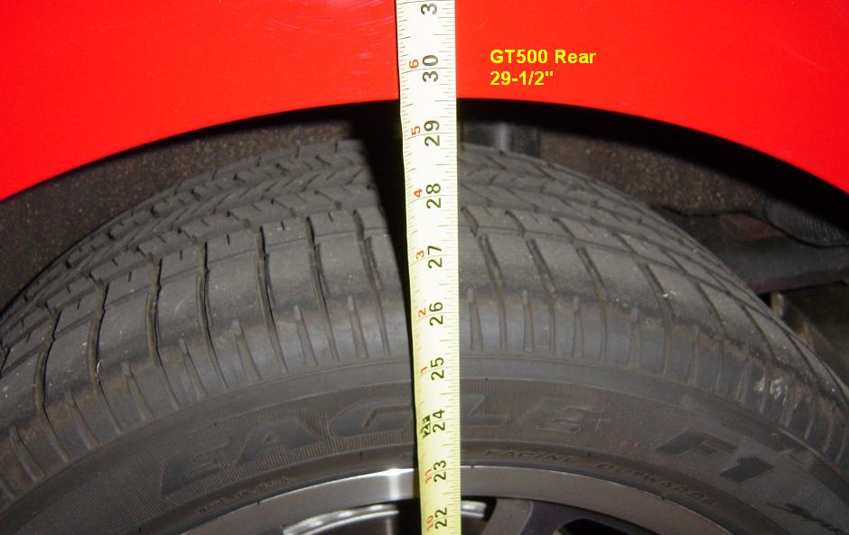 My measurements on the rear tires turned out to be one full inch higher for the GT500 and the same from the floor to the bottom of the door handle. By comparisson, from the floor to the edge of the GT's front fascia the height is seven inches where on the GT500 is six and one half inches from the floor to the edge of the chin spoiler.