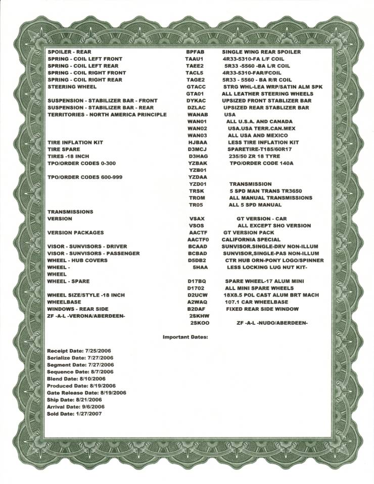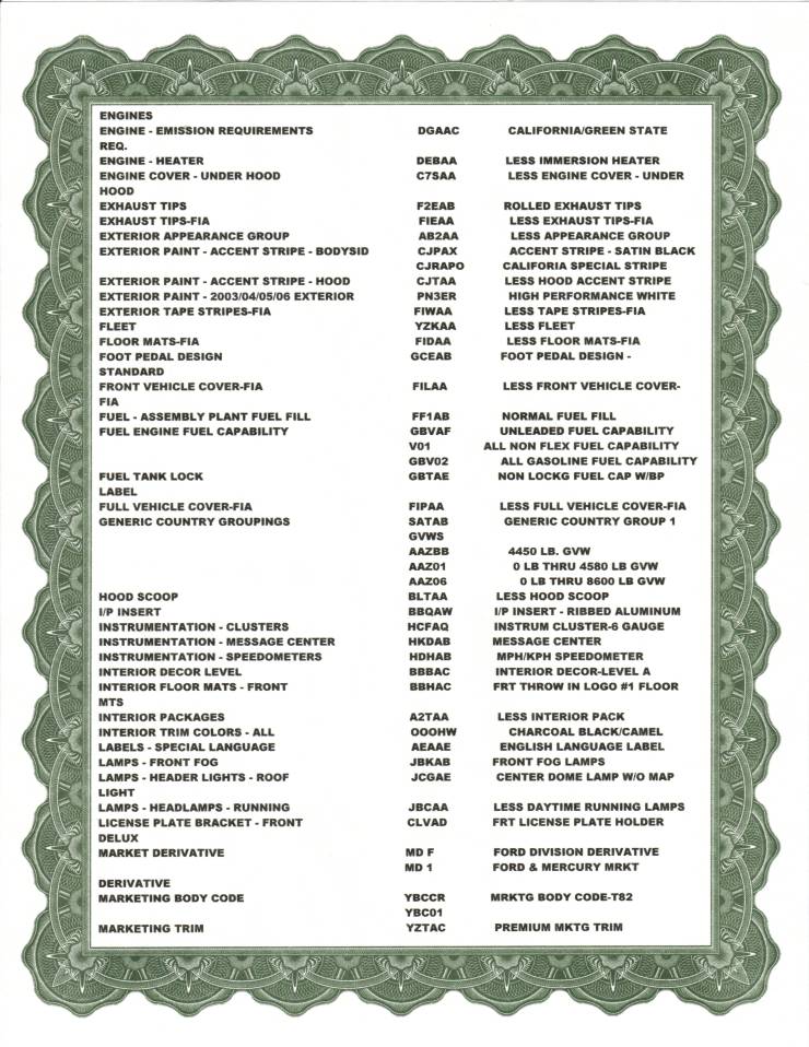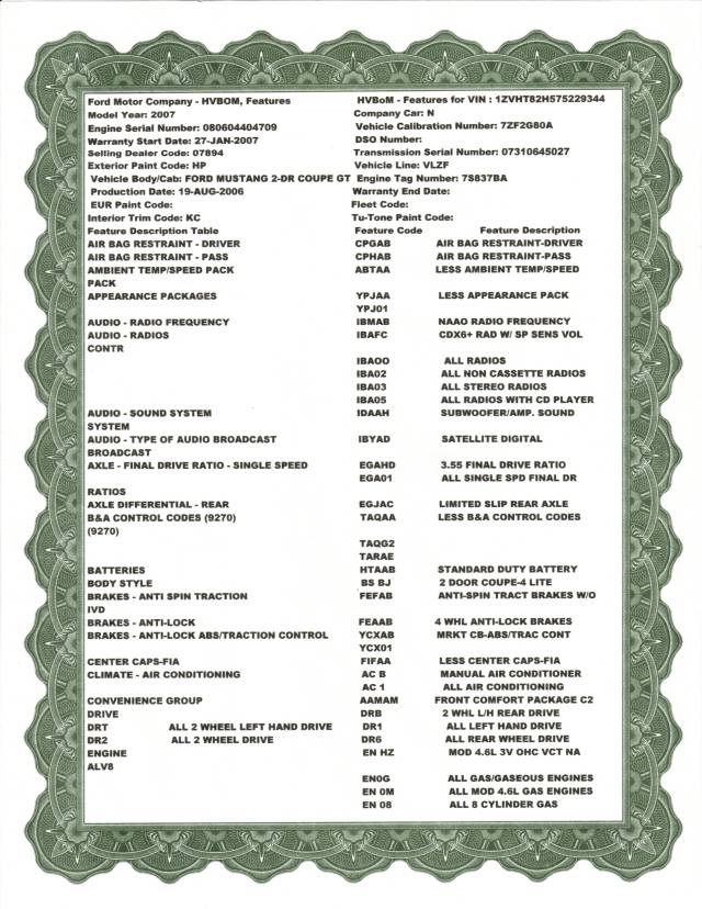 You can also email Ford and ask for a "Build Sheet" as the call it but it just shows a few options on your car and mail you the document. Here is what that looks like.