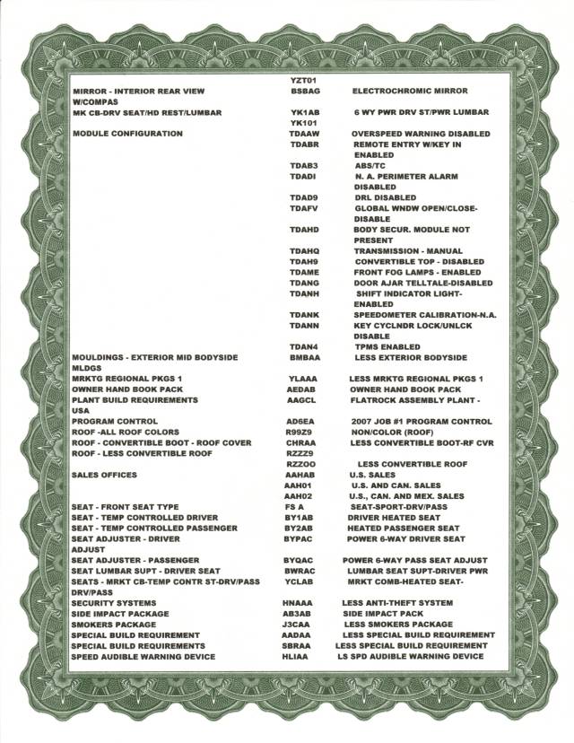 The report for me is a close to a build sheet as we can get these days since the days of build sheets being behind the seats or somewhere in the car are gone. It will give you the equipment that was either added or deleted by the factory based on how the car was ordered from the dealer which is pretty cool to me. It also will verify on our case that the car was built as a GT/CS and not just a regular GT. But over all it is just a nice piece of documentation about your ride.