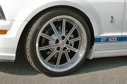 The Shelby GT driving dynamics are fine tuned with the Ford Racing Handling Pack, which was developed by the same engineers that developed the Ford Racing FR500C, which won the 2005 Grand-Am Cup Championship. New coil springs drop the overall ride height by an inch-and-a-half for a more aggressive stance and reduced body roll. Stiffer dampers and front swaybar further enhance cornering feel and body control. To showcase the key performance modifications, Ford Racing painted all the key suspension components, including the damper, spring, and swaybar Ford Racing Blue.