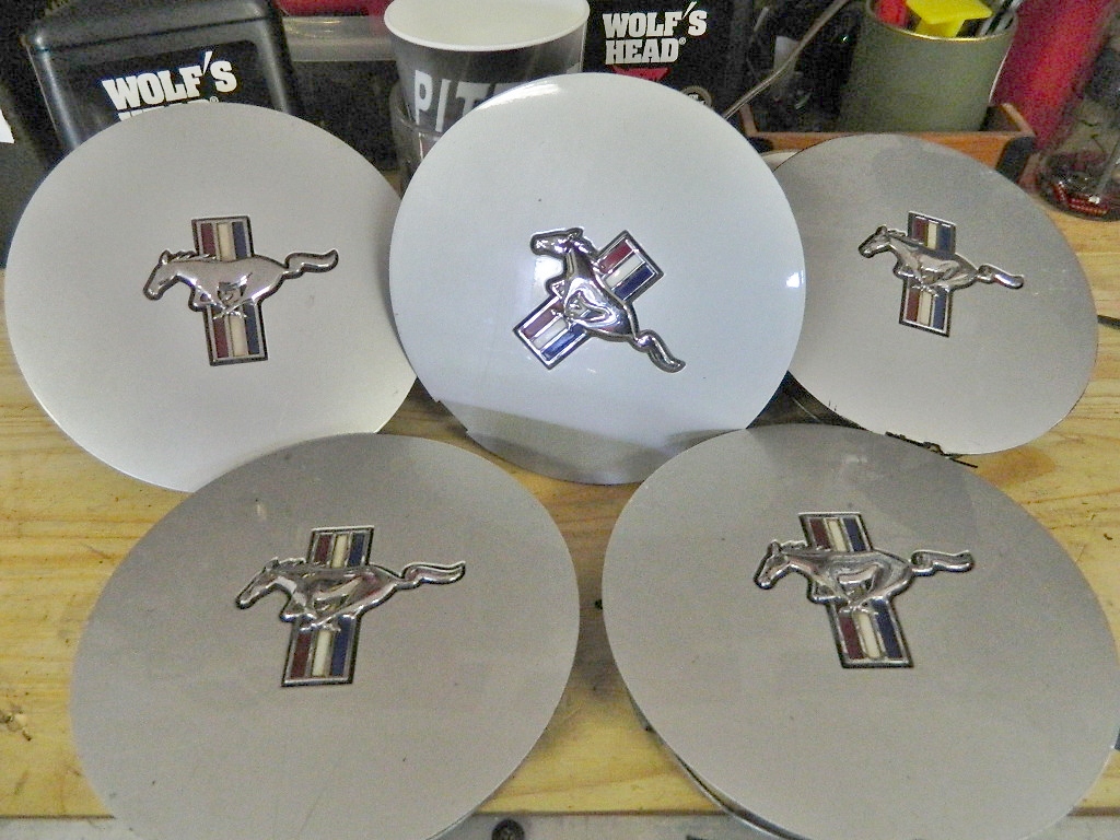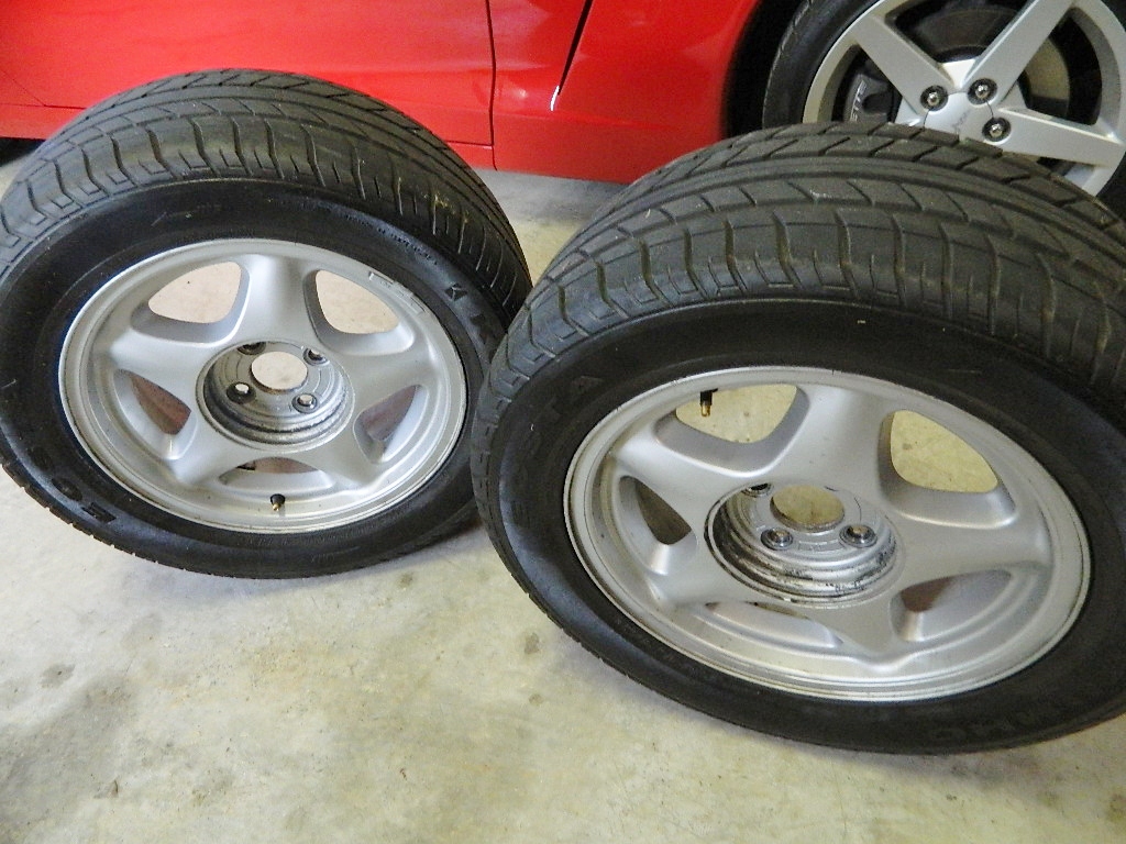 4 Pony 5star rims w/ center caps on 3 good tires and 1 tire is flat w/hole in it. $100 (must go price)