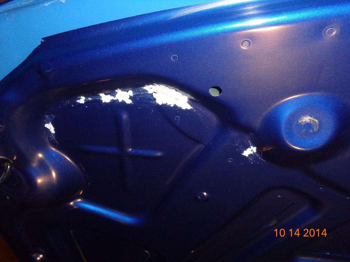 was hoping tonight to pull the hoods off the wifes 07 (20,000 miles) and my 09 (still undriven- 4 miles), to tip them nose-down, slosh some paint inside between the front layers to seal it up... her car first, had to pop the liner for access to the holes- the freaking liner is abrasive, has rubbed thru the paint all over the place, and quite a few big paint blisters UNDERNEATH the insulation... couldnt see any of them till it was removed. used one of those bent/fork christmastree plug pulling things for door panels, gotta be really careful with the insulation, made a couple dents in it