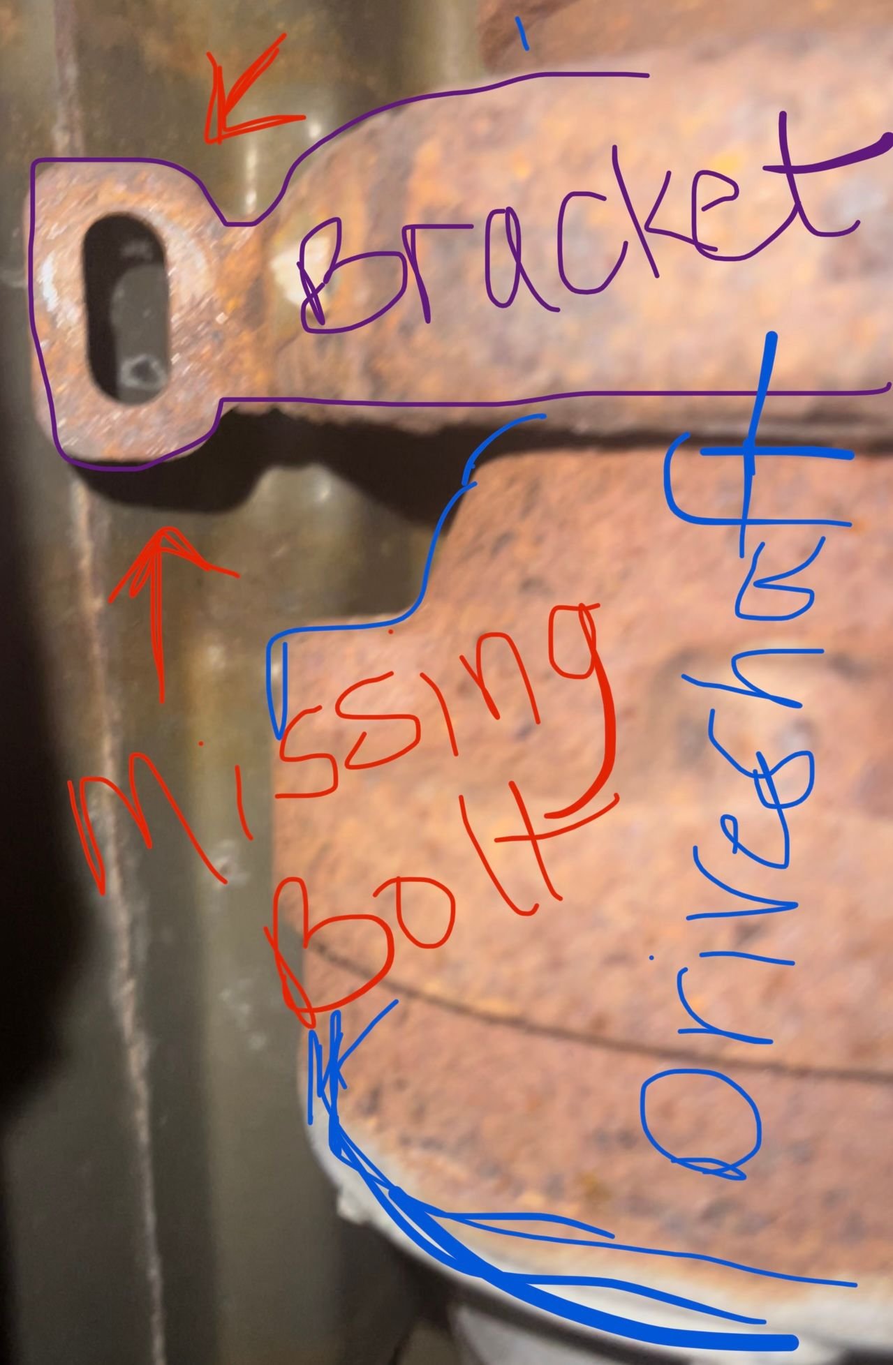 so long story short. I was driving home from work and I hit a really bad pothole on the expressway. It sounded like something really loud hit under my car. When I got off my exit it sounded like and felt like there was a basketball dribbling under my ebrake lever. And when I would take off and drive it would stop, until I hit brakes or slowed down and again this obnoxious sound by my ebrake lever returned. After getting home and jacking car up, I was able to find the problem. The driveshaft bracket that holds the driveshaft up is missing a bolt on one side and is dangling and on other side it looks to be messed up longer and it’s bolt is there but the bracket is bent and broken on both sides of that bolt that is suppose to hold it secure to the car. I will post pictures to show but it was very difficult to get pics and probably even more difficult for you all to understand what I’m meaning. My question is…how can I just buy and replace that bracket and bolt. I can only find the safety loop system for the driveshaft, which is not the same but as far as I know it can be used along with this broken bracket… I have searched the internet high and low and am unable to find just that part! Please anyone that can help I will be forever thankful for!! Thanks in advance and for anyone who suffered through this reading. : / 2007 mustang gt. Help me. Broken bracket on driveshaft. And missing bolt!! 2007 mustang gt. Help me. Broken bracket on driveshaft. And missing bolt 2007 mustang gt. Help me. Broken bracket on driveshaft. And missing bolt 2007 mustang gt. Help me. Broken bracket on driveshaft. And missing bolt