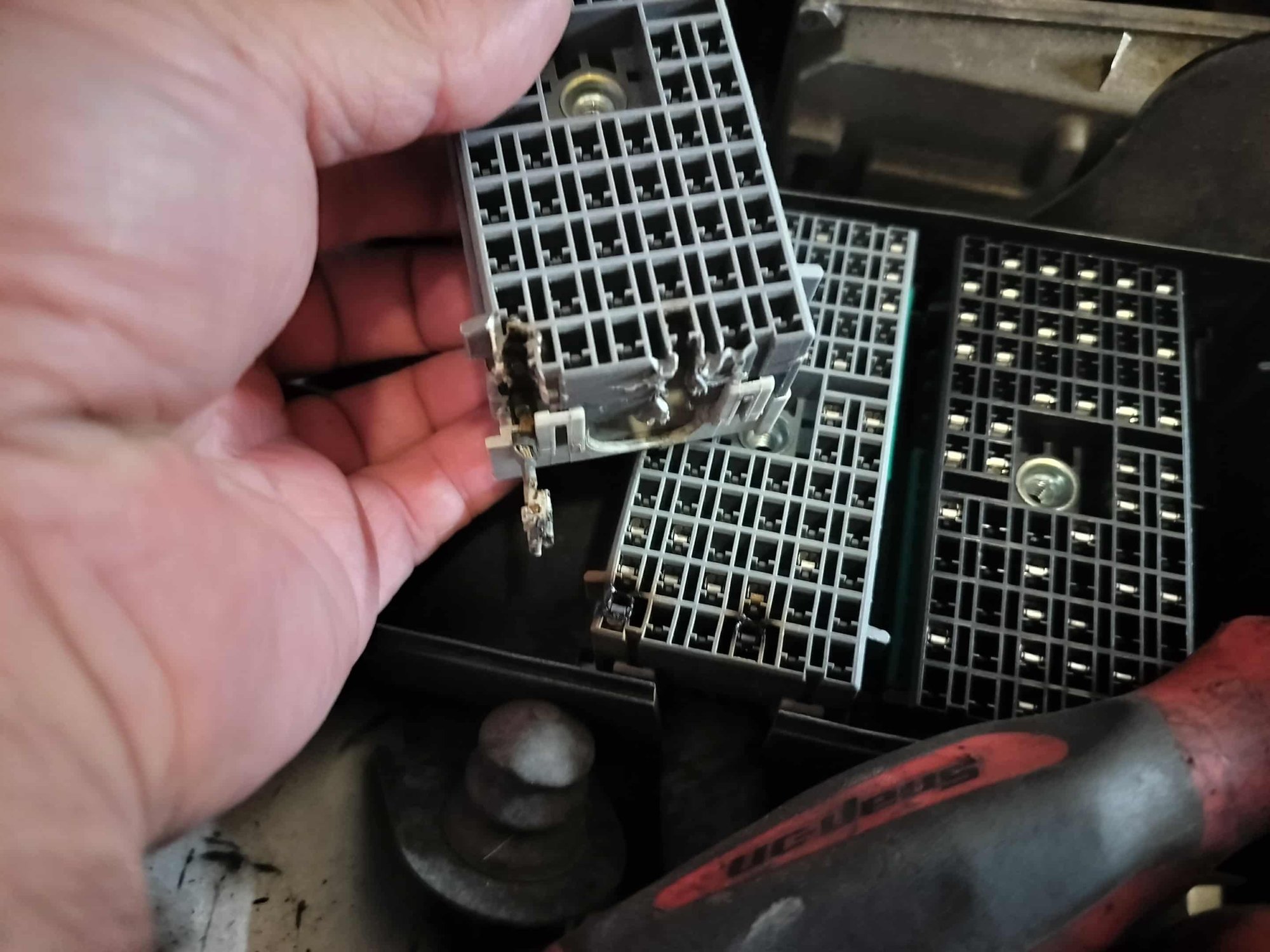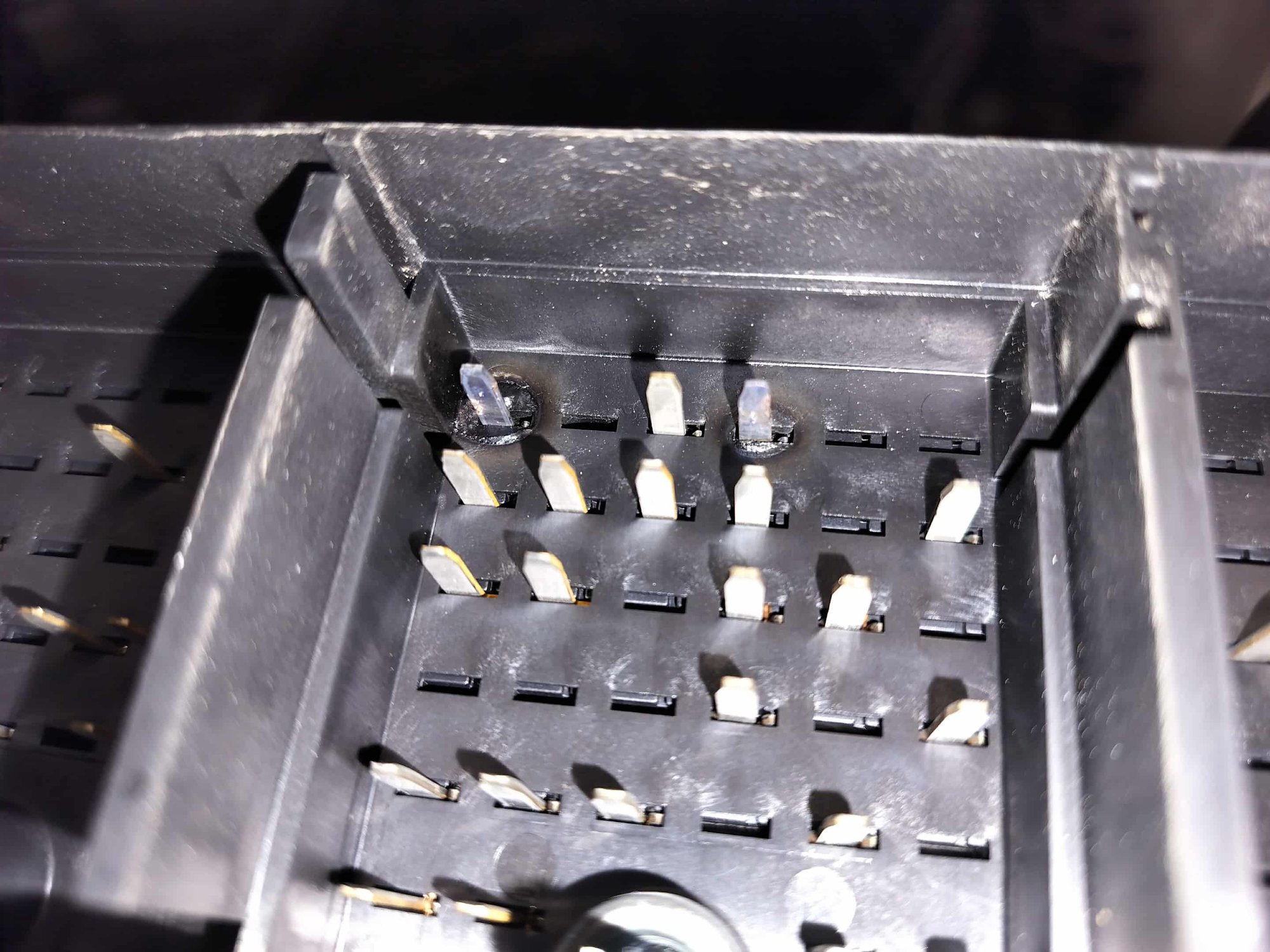 Here is the bottom of the panel where it plugs into the wiring blocks, you can see the heat damage...the junction block is more of a sacrificial piece compared to this part, but this also shows the heat damage.