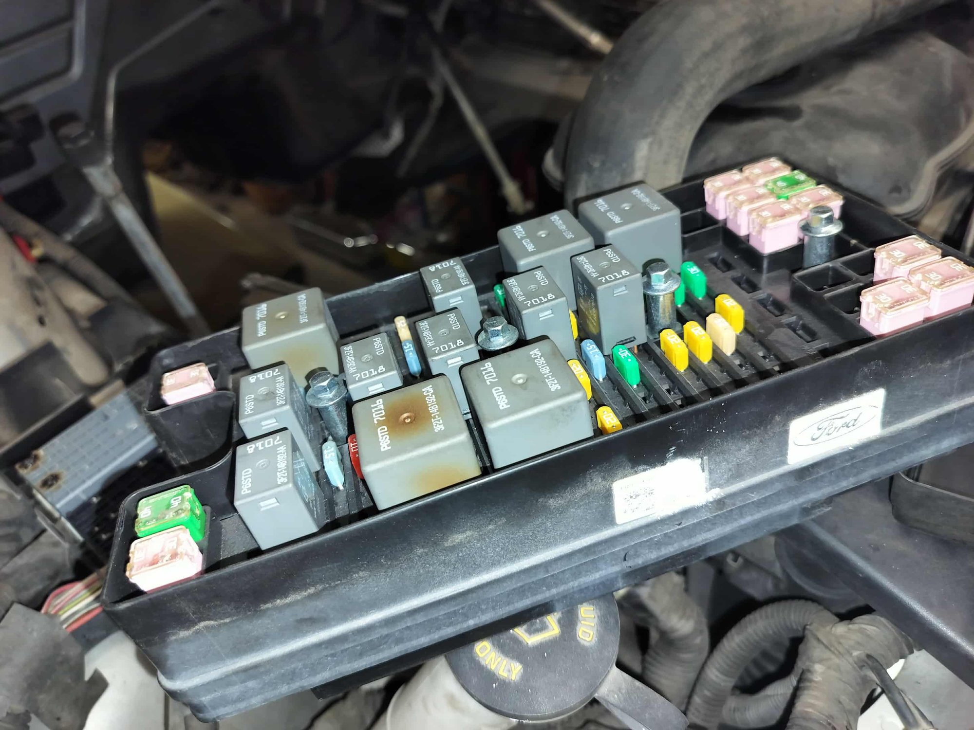 This GT may still be working and hasn't failed yet like the GT500 I fixed but it will. This is the high speed and low speed fan circuit and both have gotten hot enough to melt the block under your fuse block under the hood.