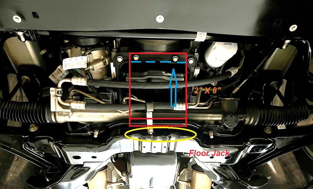 Looks like its the front of the oil pan to me. Definitely wouldn't want to jack from the balancer. I did a block of wood between the jack and the pan so you dont' dent the oil pan. He's got a pretty wide cup on his jack and lots of rags to spread out the weight which I think works too. Was actually just talking to my shop about one of their other customers this weekend and they were dealing with oil starvation issues because somebody dented the oil pan and it really restricted the space between the bottom of the pan and the oil pump pickup tube.