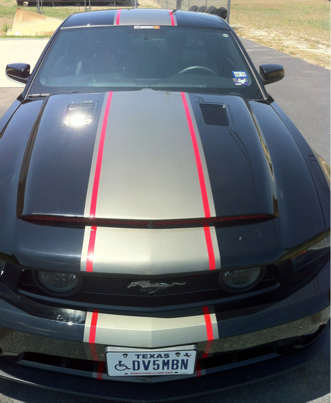 Yeah, it was a last minute thought! My ultimate choices were the Eleanor gray or subtle red. Due to the black mamba hood I chose to just do the wider lemans stripe and chose the Eleanor (Oxford or pepper gray). While explaining what I wanted to the body guy I had a brain fart. I chose to match the red on the 5.0 decal and fill the pin stripe on each side of the wider stripe with that red! It's still growing on me but thanks for the input!