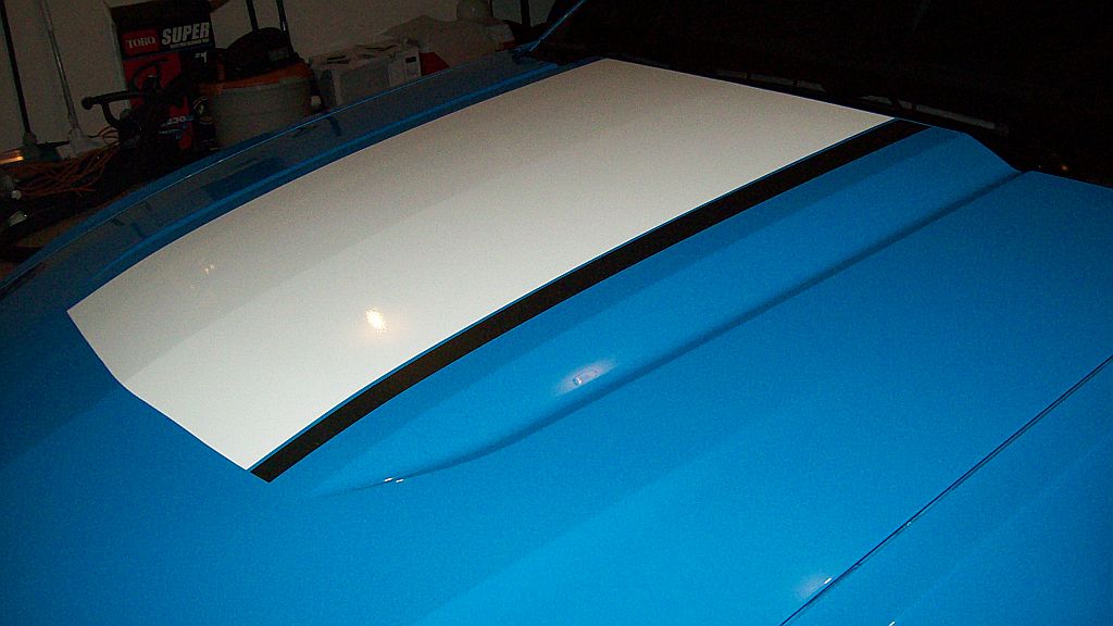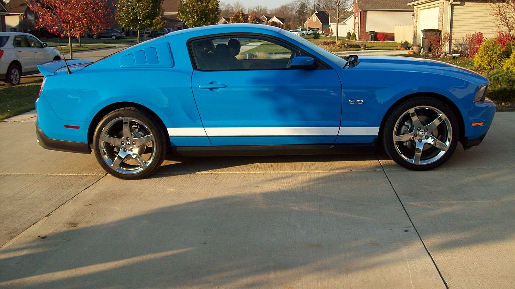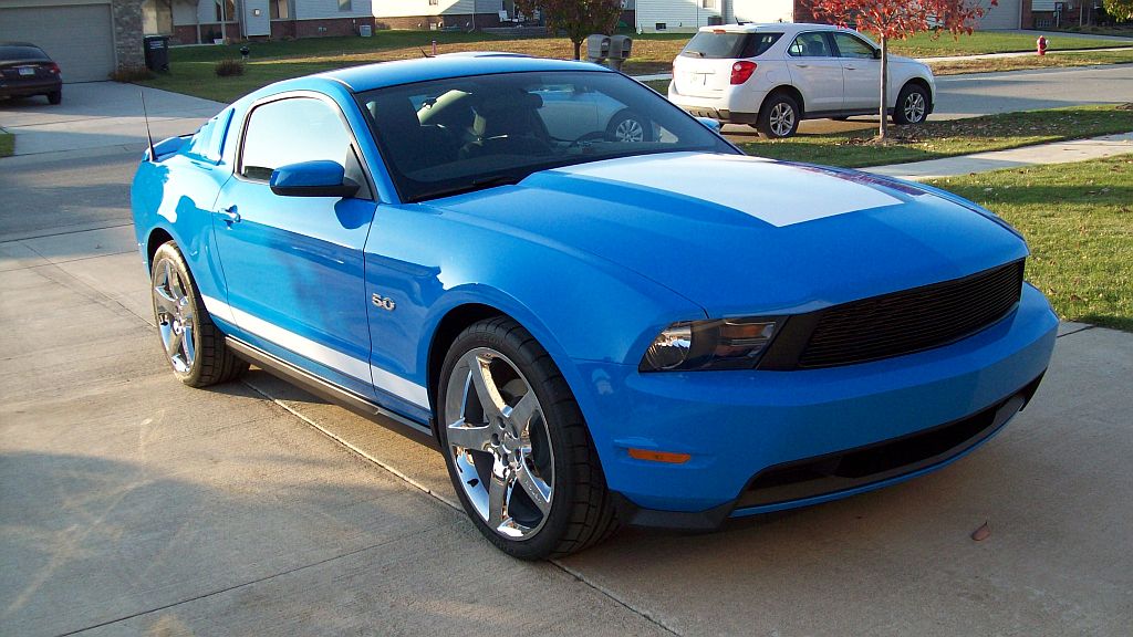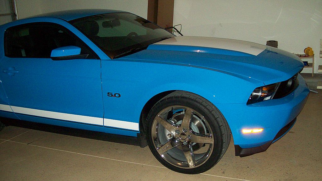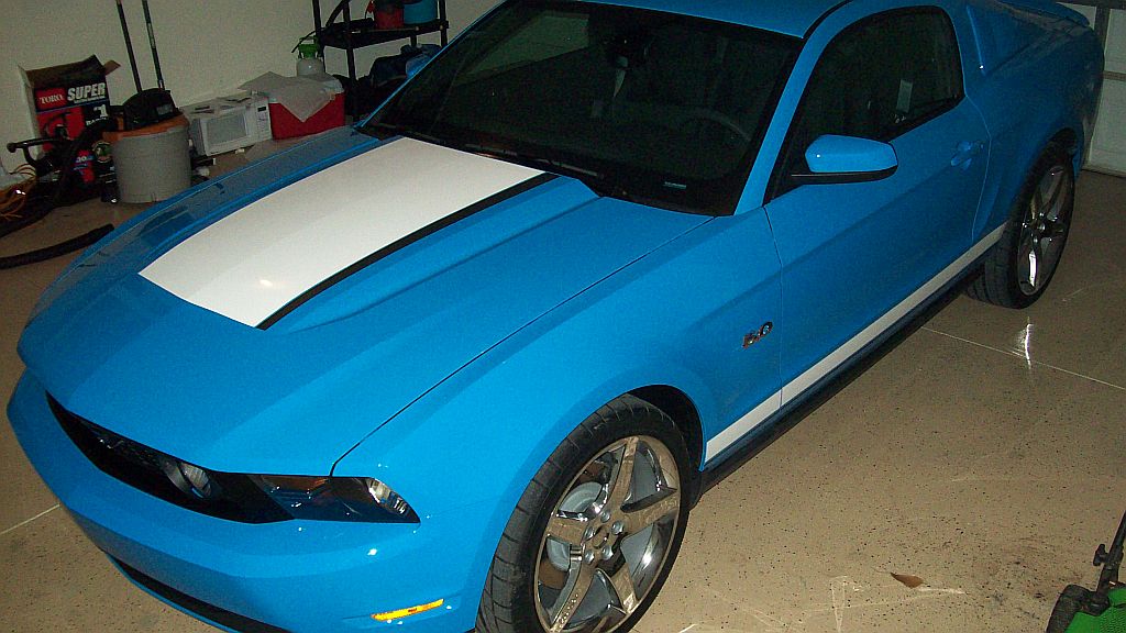 I think the white stripes add a nice contrast to the Grabber blue and the dark gray rocker moldings,although i might have the white hood stripe removed.I was kinda going for the Roush RS1 striped look.it really "POPS".I like the side scoops on your Mustang,I may add those later.