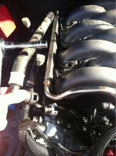 Fluid (tranny?) sprayed everywhere. Was I not supposed to disconnect that hose??? Seems like I needed to get the intake manifold off.