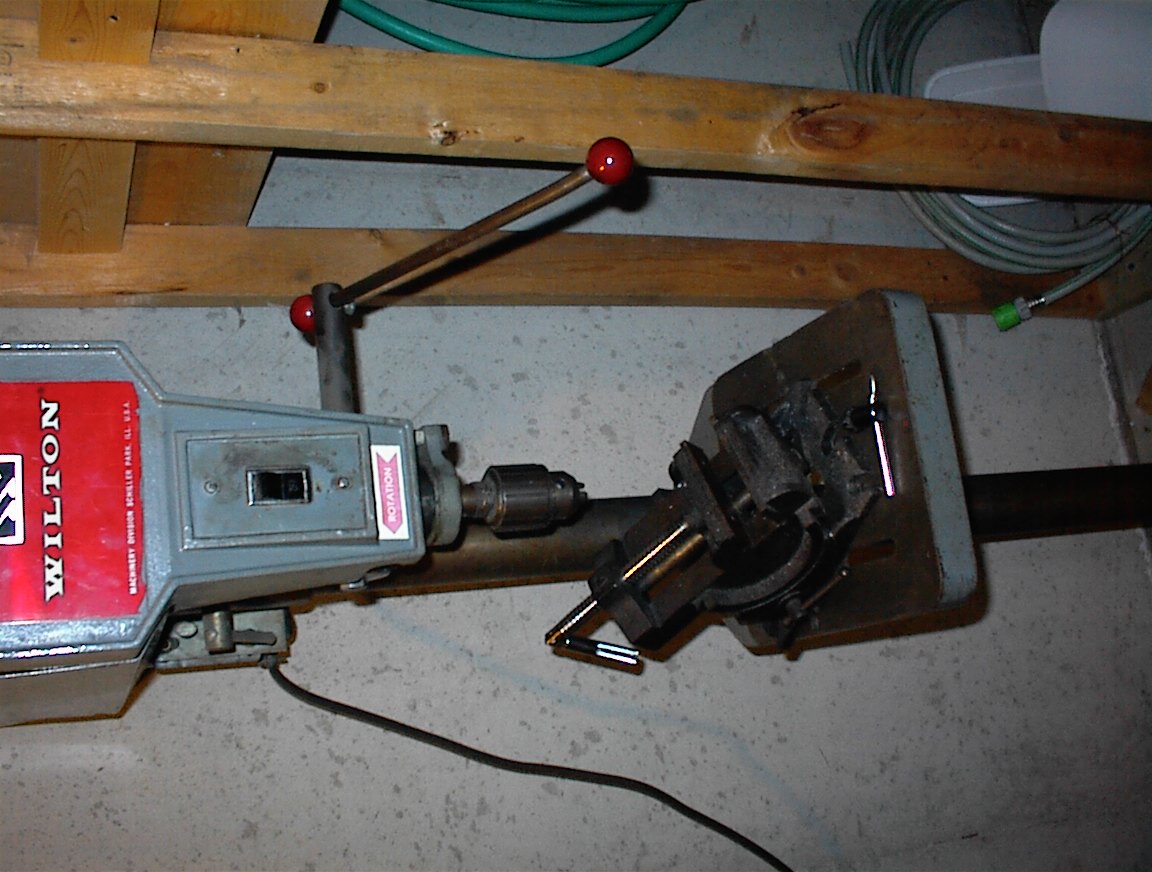 * Now comes the tough part ... tapping the M6x1 thread on a 30Deg angle !! I chucked the tap in my drill press and with the chuck key slowly turned the chuck by hand ... use plenty of tapping fluid (in my case at home ... motor oil). 1st one went pretty smooth, but went too fast on the 2nd one and broke the tap. Got the broken part out and somewhat salvaged the tap by grinding down and re-chamfered end. With this fixed tap I had to go extra slow, but I got it to finish the job.