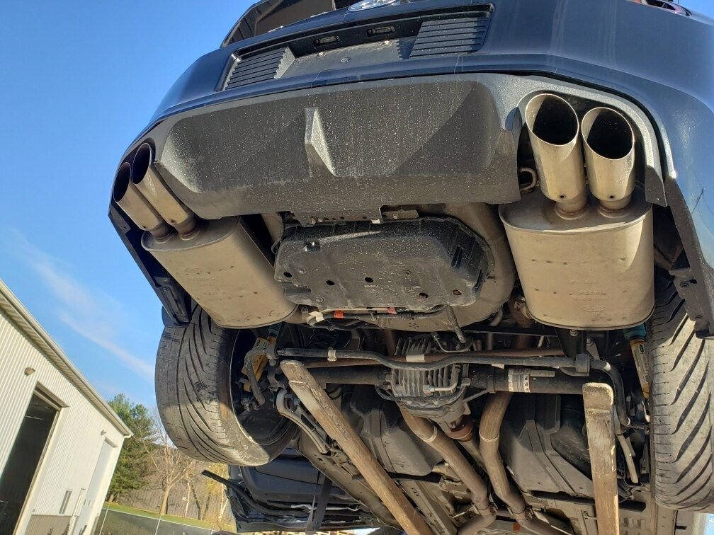 Now for the exciting part, on top of securing the 5.0 I was lucky enough to see The Parts Farm also listed Boss 302 side pipes off a recently stripped Boss. This was awesome for me because my dream exhaust setup has always been Quad GT500 axle backs, GT500 over axle pipes, Boss 302 H pipe and side exhaust, stock manifolds and cats. On my v6 only part of this setup I was running was the GT500 quad exhaust as I felt I would be doing the side pipes a disservice by putting them on the v6, and I didnt want to waste a kit. Now that I want to add them you cant find a kit to save your life and calling for you can only get the H pipe the side pipes are backordered with no ETA. So I grabbed those up quick. I was also lucky enough to see Midway Mustang had just purchase a beautiful 2014 GT500, and the rear end was untouched, I NEEDED the exhaust from it as Ford was only selling the over axle pipes the axle backs are backordered with one dealer in NJ having 5 driver side mufflers but no passenger mufflers in the entire country. And as luck would have it I managed to snag them, absolutely unscathed, Big thanks to both The Parts Farm and Erik at Midway Mustang for everything they are doing for this project, this really is a dream come true. I have parts coming for the boss side pipes as I see they are missing things like clamps and bolts, hopefully the GT500 exhaust comes with everything I need. Now if I can get Ford to change my vin to show it as a 2013 GT premium, doubt it would ever happen. More pictures: Boss Side Pipe kit, replaced the cat deletes with factory cats, as I don't want cat deletes. Axle backs and over axle pipes pristine condition