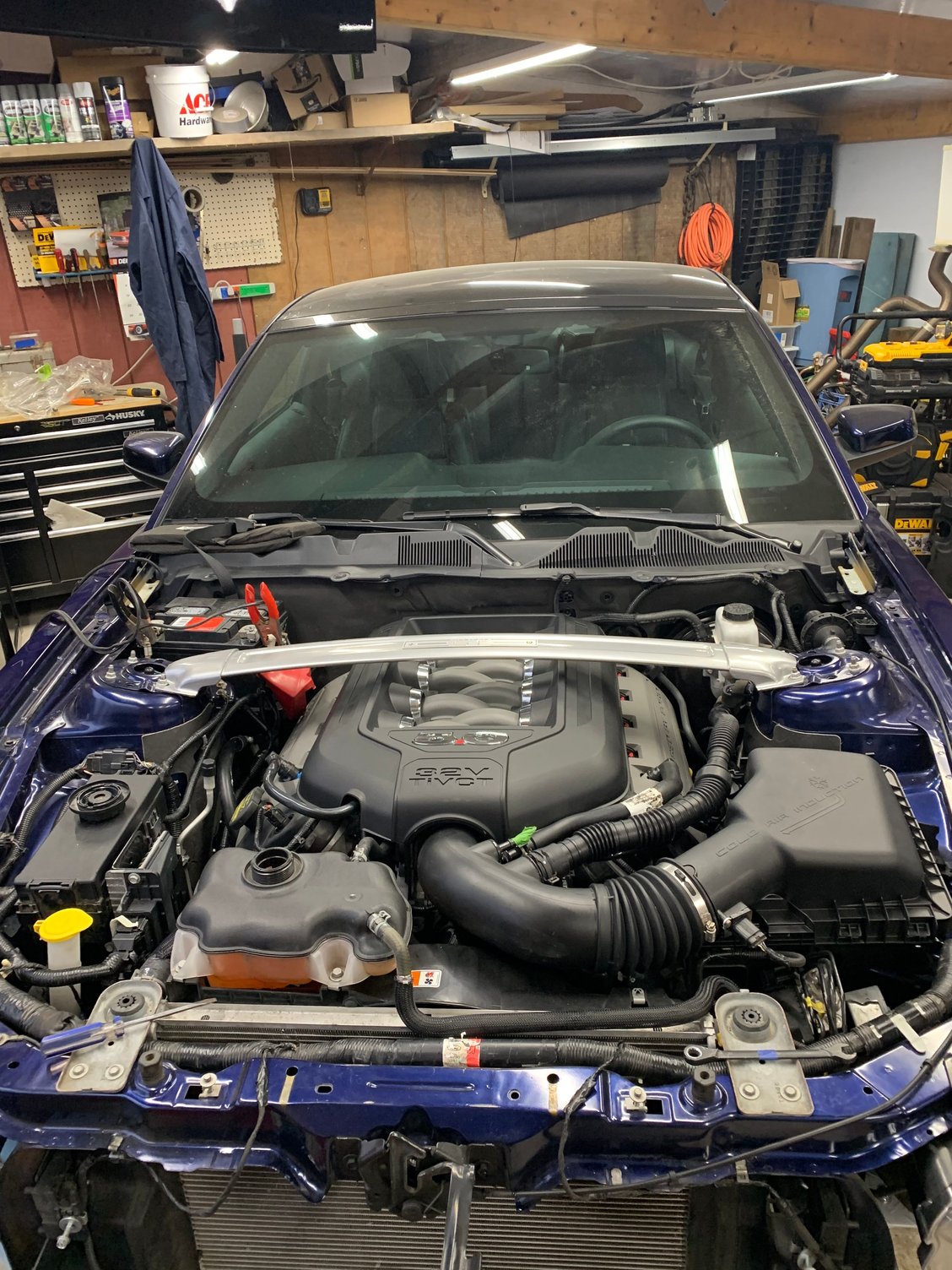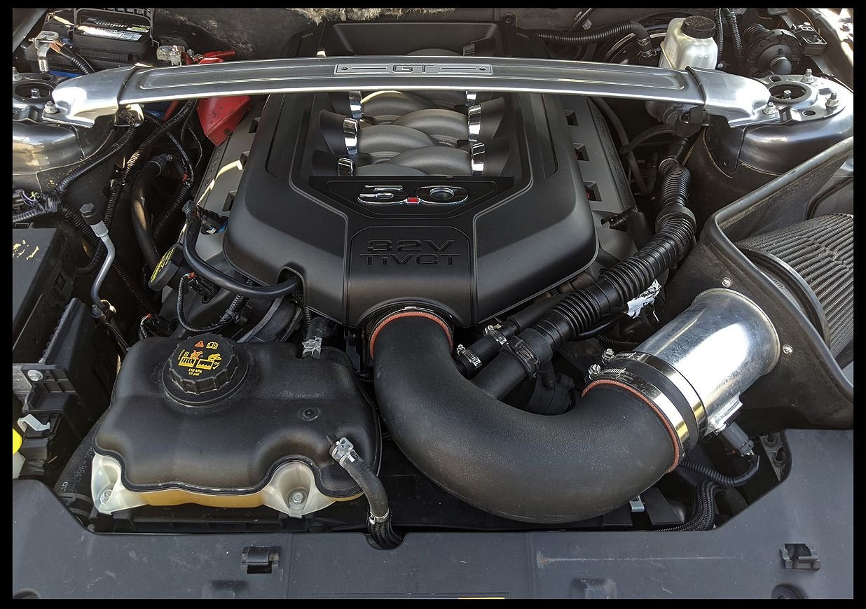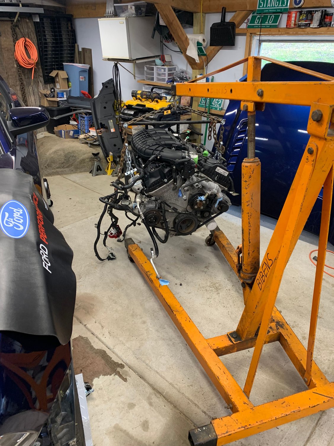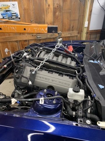 All I can say for disassembly of the old engine and transmission is a Ford service manual for your model year will be your best friend unless you have taken your car apart more times than you can count, and always put loose nuts and bolts back where you found them....or keep em organized anyways. This was what I did from my memory: First disconnect and remove the battery, Remove battery tray and disconnect and remove air intake. Remove strut tower brace if equipped. (good time to mention you might want the GT one if you like the fancy plaque that comes on it)_Next Remove the radiator cover, then remove the hood insulator, disconnect washer pipes and tuck out of the way, then remove and hood and set it aside, then turn to the front bumper and remove it, headlights can now be removed and so can the bumper support bracket on 13-14s next drain the radiator(will be a drain plug on the bottom of the passenger side) while that drains turn your attention to the exhaust, I suggest a lift but I only had jack stands, I went as far up as I could with them. I unbolted the axle backs first and wrestled them out, next I unbolted the over axle pipes and fought to get them out passenger side was fine but driver side was a struggle with the low clearance. Then I unbolted the mid pipe/cats from the exhaust manifolds.(dont forget to disconnect o2 sensors) Now remove the v6 driveshaft, now the radiator should be mostly drained. You will now need to remove just about every radiator hose, careful as more coolant will pour outta these. Now you will need to disconnect the ac compressor from the ac condenser as someone that doesnt own a ac reclaimer this was hard, I ended up follow factory procedure to drain it using a vacuum pump and a manifold gauge set, I don't recommend it, as I felt like I was venting it slowly into the atmosphere as there is no catch can for the R134 refrigerant. Now I am also in a awkward rush to get everything in and drivable to get the new ac system charged at a dealership before the salt gets thrown on the roads, needless to say I am stressing out hard about getting this part done. Now we can disconnect the ac hoses from the condenser and the radiator and condenser unit can be pulled, this will open up room to drop the new engine in later. Now just go along and disconnect any hoses and pipes that are still attached to the engine like fuel line, vacuum hose, emissions vapor hose these all need longer hoses and do not get reused. Most radiator hoses also do not get reused as the engine bay will get tighter. The heater hoses going into the interior of the car also do not get reused as the new hookups on the 5.0 are in the front of the motor instead of the rear like the 3.7. Also use this time to disconnect the engine wiring harness from the engine bay harness and PCM, as well as the power steering module. You will need to drain the oil out of your old motor but I would leave the oil filter in. I did not drain the transmission as these shouldnt leak out the back like older transmissions. Next unbolted the transmission support plate and shifter nuts, and disconnected the clutch hydraulic line (no clue how this is on a automatic) next I unplugged the transmission electrical plugs and tucked the harness out of the way. now I removed the 8? studs and bolts holding the transmission on to the engine and supported the transmission with a jack and wood while I lowered it out of the car, you need to pry it back first and on jack stands this is extremely difficult go find a second person to help, then I was able to just squeeze it out of the car from the front but that was the transmission out. Now the motor is probably leaning backwards into your firewall which means you've done it right so far as it should just be on the motor mounts now, after making sure everything is disconnected (including the ground under the wiper plastic cover things) go ahead and choose your favorite way to pull it out I opted for generic brackets that came with my engine load leveler and some bolts in the factory lift holes. there are 4 in each corner of the engine near the exhaust manifolds, no I don't know what size bolt (metric) but I had to use washers with them. Now unbolt the motor from the mounts 2 nuts, and you can begin lifting the 3.7 out go slow and watch for anything not disconnected, go ahead and disconnect stuff if you forgot. If you couldn't get to the heater hoses before now is a good time to disconnect them. Anyways motor should now be out. This is about as far as I can go with the write up as I am waiting for all my parts to trickle in. But this shall be continued probably with more pictures than what I took, scroll down to see them. Donor 5.0, going to change that CAI to the stock airbox Farewell old friend you served me well for 48K miles removing bumper stripping things out, bumper removed Draining radiator, probably should have been on a more flat or downhill angle oh well. Tranny and exhaust removed (v6 and v8 mt82's are different) Radiator out, you can see the motor is leaning back pretty good Motor out Here you can see sorta where I attached to remove it. Waiting to clean up the wiring Started to clean up the wiring, but I added the strut tower insulators that the v6 and early 2011 v8's were missing, first time I ever got that GT brace to fit, the lines I have left in the car are the ones that can be kept, you can see I put the new 5.0 fuel line in however.