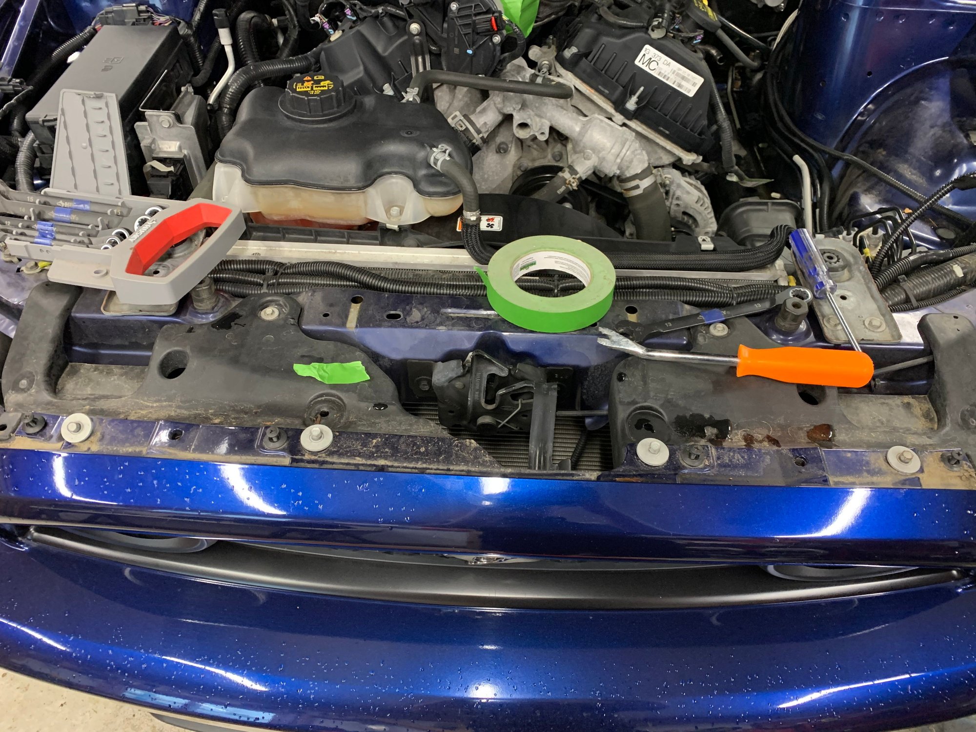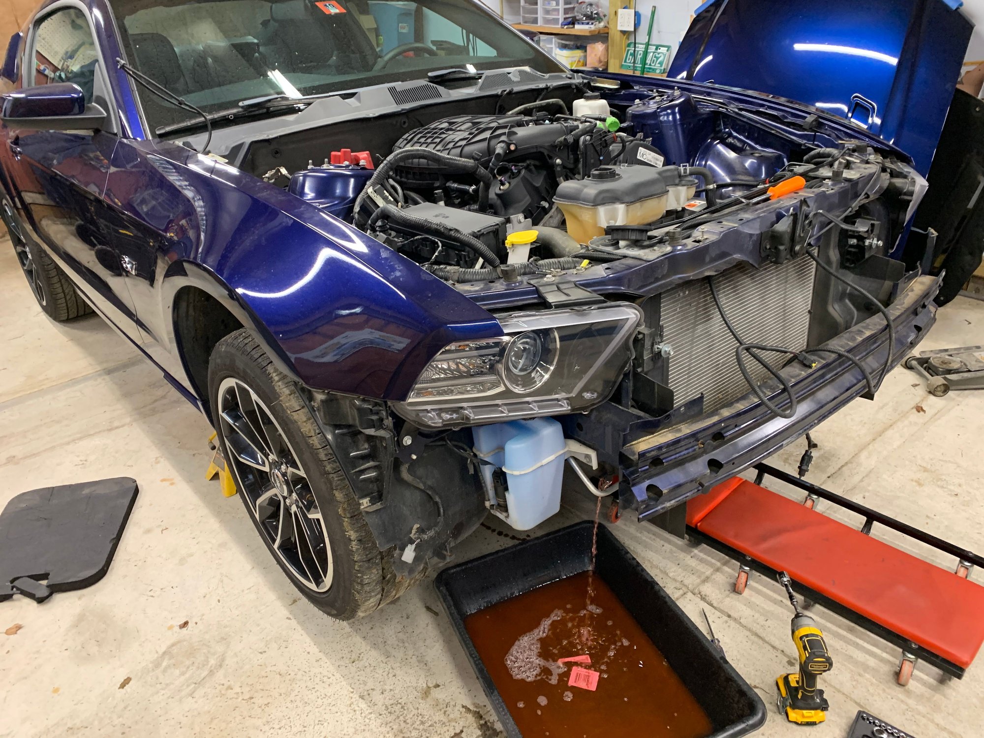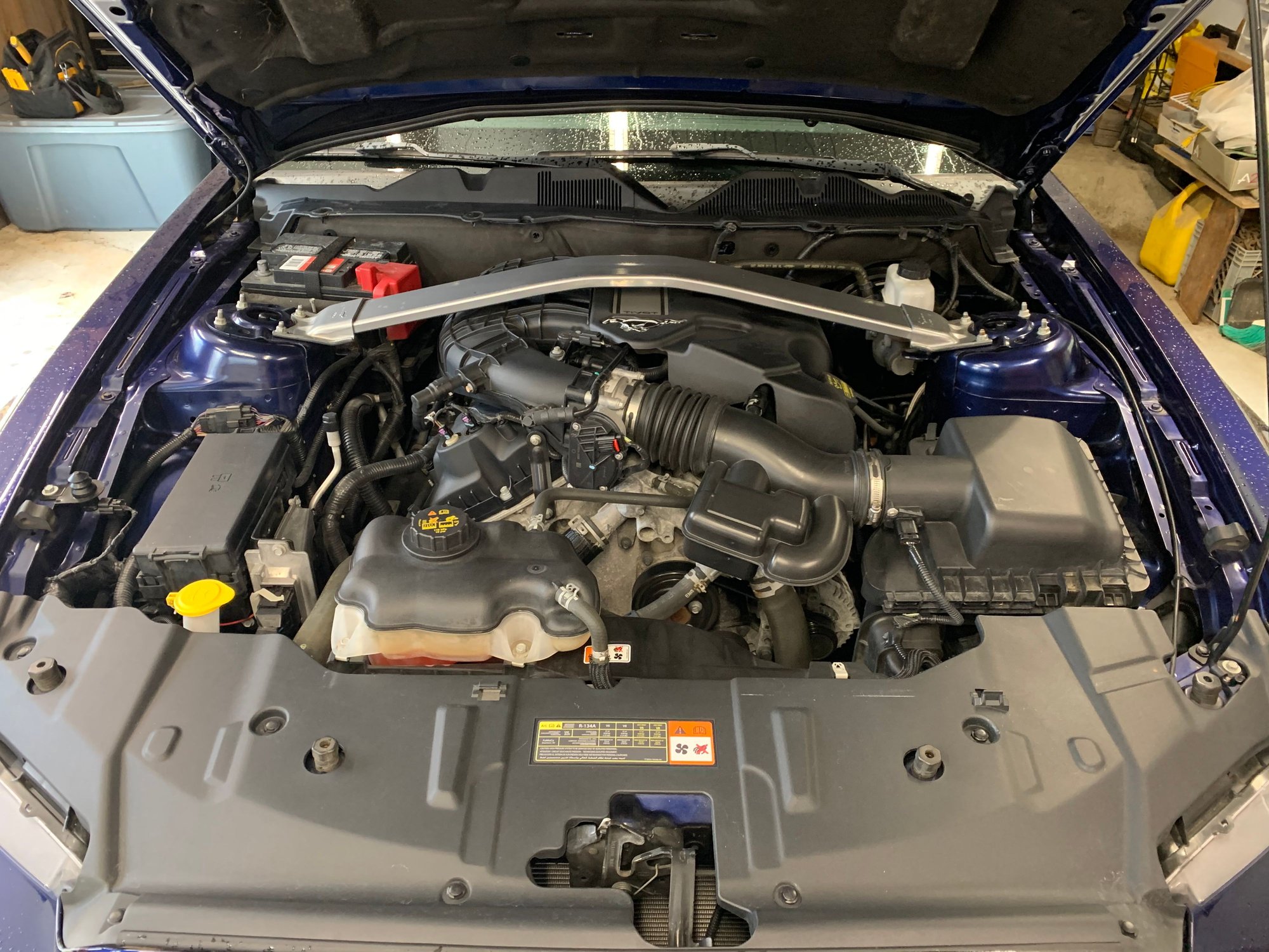 All I can say for disassembly of the old engine and transmission is a Ford service manual for your model year will be your best friend unless you have taken your car apart more times than you can count, and always put loose nuts and bolts back where you found them....or keep em organized anyways. This was what I did from my memory: First disconnect and remove the battery, Remove battery tray and disconnect and remove air intake. Remove strut tower brace if equipped. (good time to mention you might want the GT one if you like the fancy plaque that comes on it)_Next Remove the radiator cover, then remove the hood insulator, disconnect washer pipes and tuck out of the way, then remove and hood and set it aside, then turn to the front bumper and remove it, headlights can now be removed and so can the bumper support bracket on 13-14s next drain the radiator(will be a drain plug on the bottom of the passenger side) while that drains turn your attention to the exhaust, I suggest a lift but I only had jack stands, I went as far up as I could with them. I unbolted the axle backs first and wrestled them out, next I unbolted the over axle pipes and fought to get them out passenger side was fine but driver side was a struggle with the low clearance. Then I unbolted the mid pipe/cats from the exhaust manifolds.(dont forget to disconnect o2 sensors) Now remove the v6 driveshaft, now the radiator should be mostly drained. You will now need to remove just about every radiator hose, careful as more coolant will pour outta these. Now you will need to disconnect the ac compressor from the ac condenser as someone that doesnt own a ac reclaimer this was hard, I ended up follow factory procedure to drain it using a vacuum pump and a manifold gauge set, I don't recommend it, as I felt like I was venting it slowly into the atmosphere as there is no catch can for the R134 refrigerant. Now I am also in a awkward rush to get everything in and drivable to get the new ac system charged at a dealership before the salt gets thrown on the roads, needless to say I am stressing out hard about getting this part done. Now we can disconnect the ac hoses from the condenser and the radiator and condenser unit can be pulled, this will open up room to drop the new engine in later. Now just go along and disconnect any hoses and pipes that are still attached to the engine like fuel line, vacuum hose, emissions vapor hose these all need longer hoses and do not get reused. Most radiator hoses also do not get reused as the engine bay will get tighter. The heater hoses going into the interior of the car also do not get reused as the new hookups on the 5.0 are in the front of the motor instead of the rear like the 3.7. Also use this time to disconnect the engine wiring harness from the engine bay harness and PCM, as well as the power steering module. You will need to drain the oil out of your old motor but I would leave the oil filter in. I did not drain the transmission as these shouldnt leak out the back like older transmissions. Next unbolted the transmission support plate and shifter nuts, and disconnected the clutch hydraulic line (no clue how this is on a automatic) next I unplugged the transmission electrical plugs and tucked the harness out of the way. now I removed the 8? studs and bolts holding the transmission on to the engine and supported the transmission with a jack and wood while I lowered it out of the car, you need to pry it back first and on jack stands this is extremely difficult go find a second person to help, then I was able to just squeeze it out of the car from the front but that was the transmission out. Now the motor is probably leaning backwards into your firewall which means you've done it right so far as it should just be on the motor mounts now, after making sure everything is disconnected (including the ground under the wiper plastic cover things) go ahead and choose your favorite way to pull it out I opted for generic brackets that came with my engine load leveler and some bolts in the factory lift holes. there are 4 in each corner of the engine near the exhaust manifolds, no I don't know what size bolt (metric) but I had to use washers with them. Now unbolt the motor from the mounts 2 nuts, and you can begin lifting the 3.7 out go slow and watch for anything not disconnected, go ahead and disconnect stuff if you forgot. If you couldn't get to the heater hoses before now is a good time to disconnect them. Anyways motor should now be out. This is about as far as I can go with the write up as I am waiting for all my parts to trickle in. But this shall be continued probably with more pictures than what I took, scroll down to see them. Donor 5.0, going to change that CAI to the stock airbox Farewell old friend you served me well for 48K miles removing bumper stripping things out, bumper removed Draining radiator, probably should have been on a more flat or downhill angle oh well. Tranny and exhaust removed (v6 and v8 mt82's are different) Radiator out, you can see the motor is leaning back pretty good Motor out Here you can see sorta where I attached to remove it. Waiting to clean up the wiring Started to clean up the wiring, but I added the strut tower insulators that the v6 and early 2011 v8's were missing, first time I ever got that GT brace to fit, the lines I have left in the car are the ones that can be kept, you can see I put the new 5.0 fuel line in however.