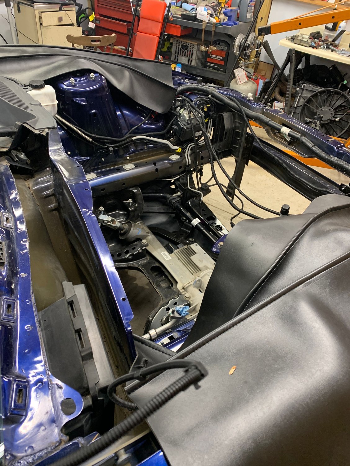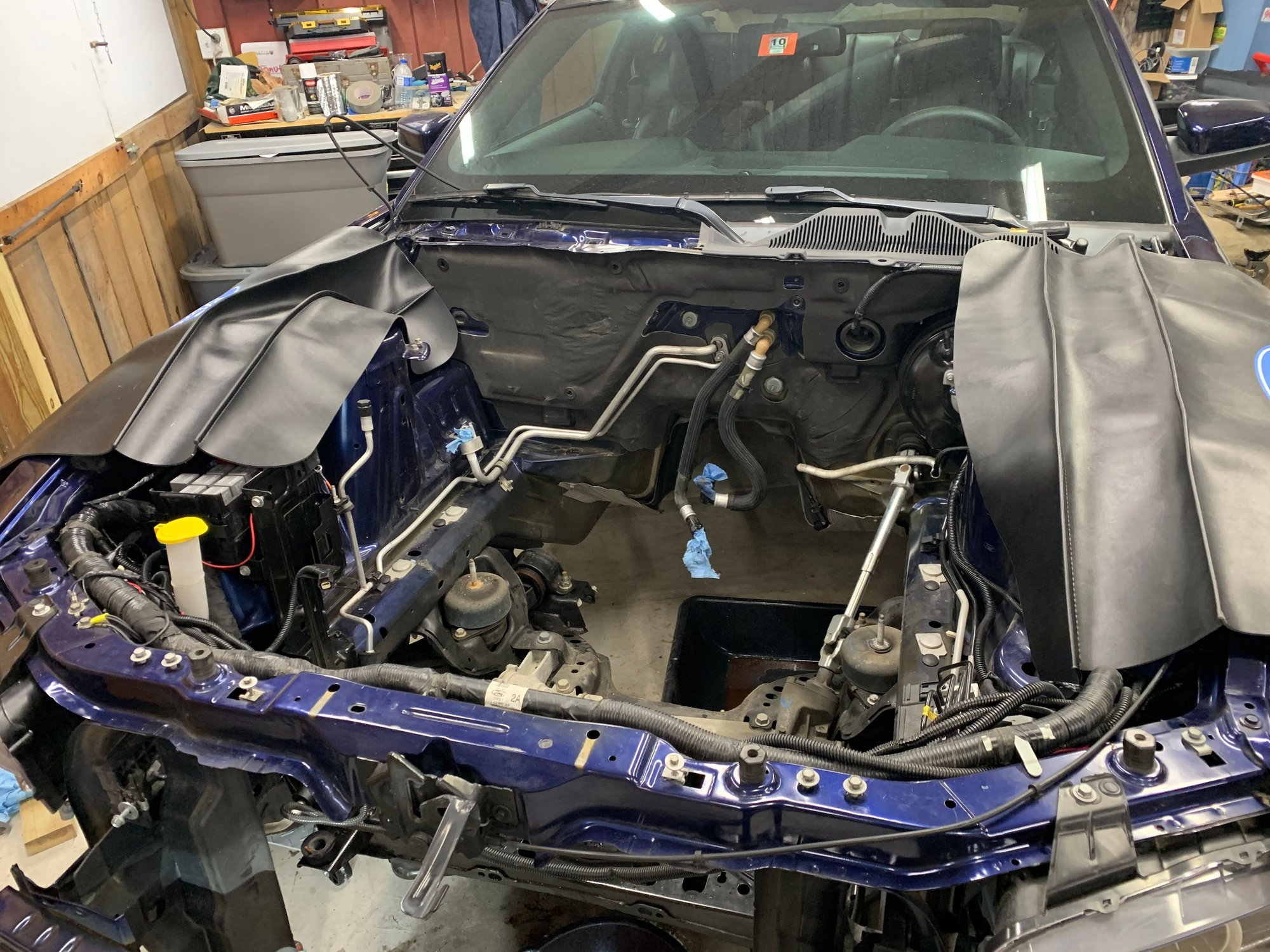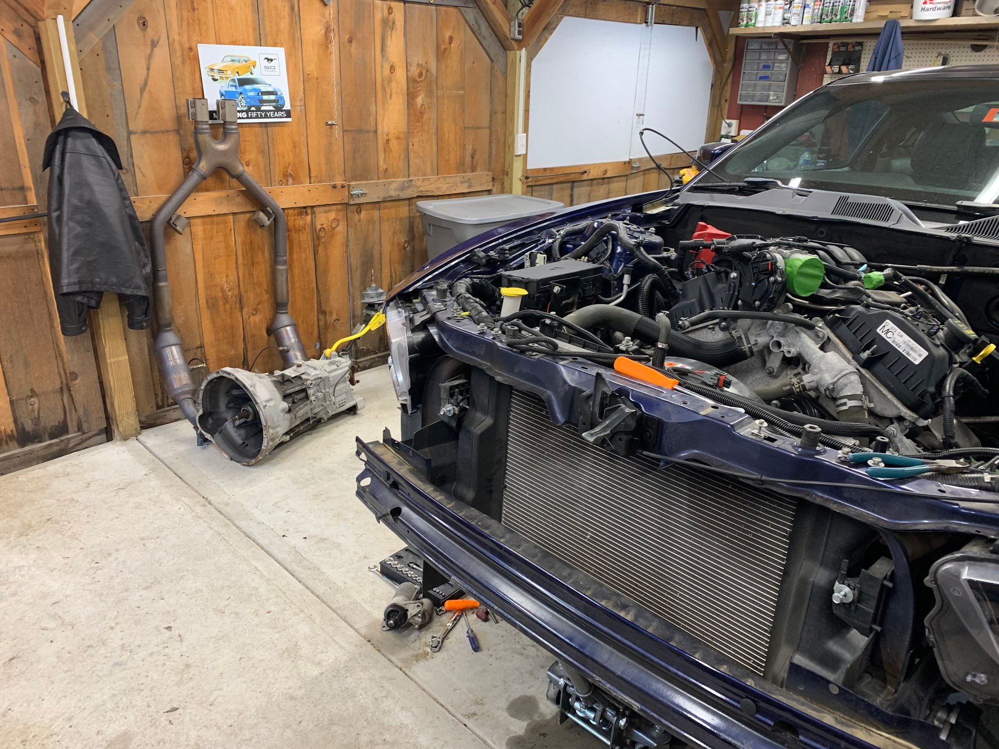 Anyways everything worked out fantastic and I was able to buy a Gen 1 2013 mustang GT drivetrain from The Parts Farm on the 14th of October. Still awaiting delivery of it as of 11/05/2020, It was a fair deal and had free shipping. I then started to (prematurely) pull my old engine and transmission out. So far engine and transmission is out, I took them out separate as space was an issue with the engine hoist, However I am going to try and put the new drivetrain in as an assembly. I havent taken the old engine bay harness out as I want to pull the old one while I put the new one in, However the engine bay harness is disconnected from the SJB and driver side pedals and connector, something which can be done with the dash in. There is one wire I will have to run, which if for my security package hood switch, which the new harness probably wont have. I have tons of orders out with tasca and my local dealership.