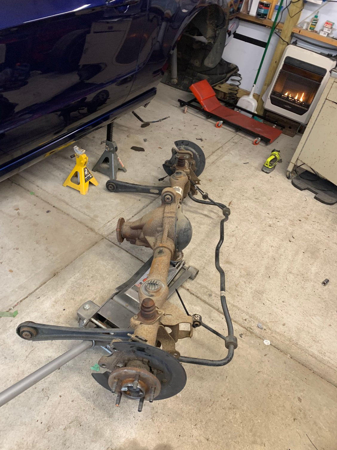 So car now runs and drives. I didn't drive it much only pulled it out of the garage and back in to clean up some trans fluid. But from what I can tell everything seems really good. Still waiting for cats before I take it on a public road. But today I dropped my old v6 2.73 rear axle out of the car and swapped it for the matching 3.73 rear axle from the donor car of my motor. was pretty straight forward not a lot holding it on. I managed to do the axle swap in about an afternoon with jack stands, longest part for me which brought me into the night was I had a frozen brake piston and ended up replacing and bleeding old breaks for the ones that came with the axle. After the rear end was back together I pulled the drain plug on my transmission and to my surprise it was still full of fluid. I was told that they would be sent drained. Not a huge deal but if I knew there was still fluid I wouldn't of drained it. It was a chore filling the transmission in the car. I might take it to a dealer so they can check the level as im not sure its filled all the way. After that I kind of loosely connected and zip tied the exhaust system and lowered the car. It was then time to start it and pull it out real quick. Old axle dropped out