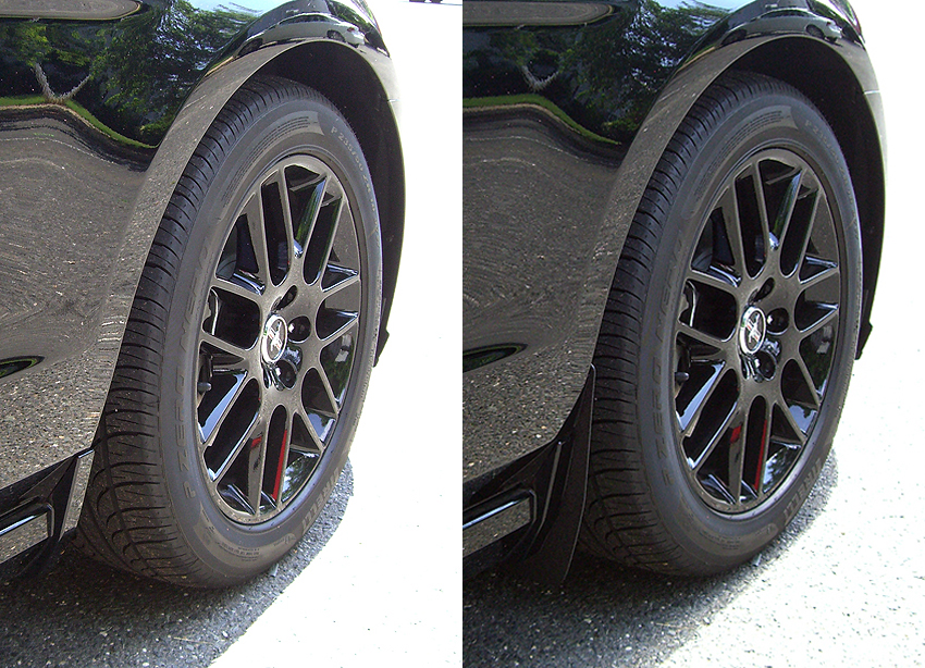 Just pop out the factory tabs and use them to install the flaps. They do seem to work pretty well. After driving on a dirt road there was a decent splattering on the flaps and very little on the paint. It's hard to see in the pictures, but the back of them has a texture that makes them at least a bit more stylish.