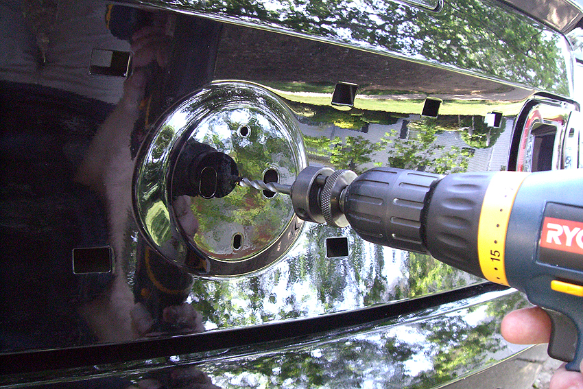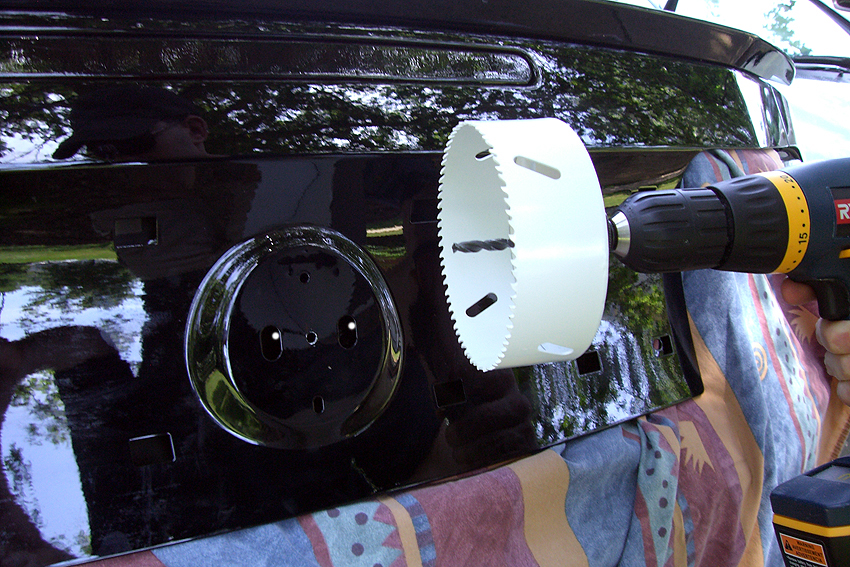 A 5" hole saw. This took some time and patience. Not to mention a steady arm. I recommend a folding chair for you to sit on for this one. You have to let the saw do all the work here. Try to push it at all and it will grip, then fly off. There's a small nick under the bump in my pics that is the result of this happening. It didn't matter that much, as the entire back will be covered when it's done. (Eye shields or glasses are a must for this, btw. Metal shavings went everywhere.)