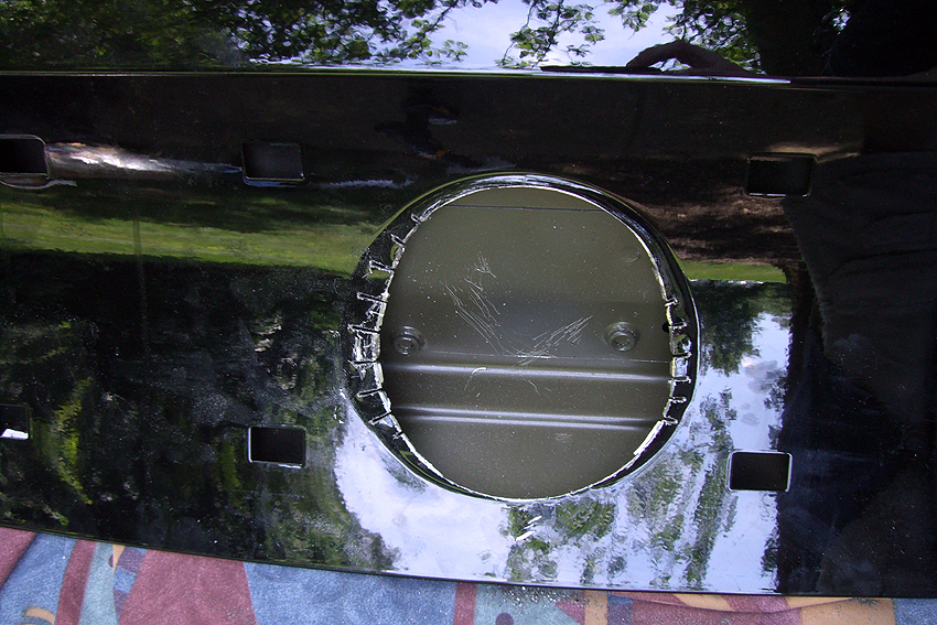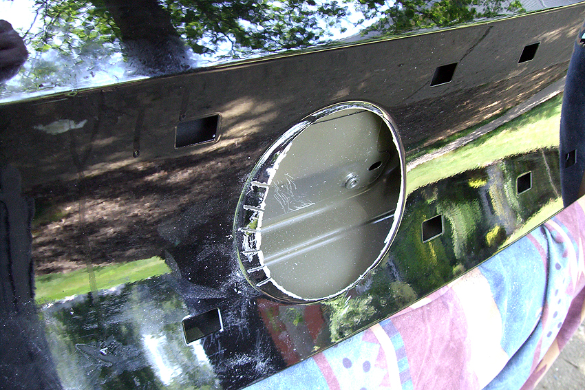 Here was the first mistake. The 5" hole saw was too small, even though it's exactly what the directions ask for. The new deck lid panel is flush to the back of the car and there was still too much of the bump sticking out to place it on properly. So, I needed to improvise. Fortunately, I have a small hand-held metal saw. I cut out slices and hammered them in.