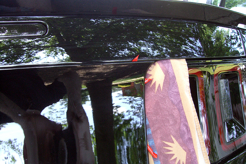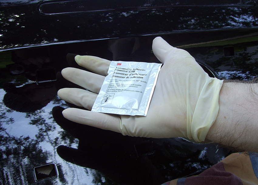 Have you ever gotten a scratch on your car that only you will see unless someone gets real close? Here was my mistake. Remember when I said that those metal shavings go everywhere? Well, one jumped on my cloth. When I ran my hand along the adhesive line... I ended up getting out my polish and wax and went at it for a good ten minutes.