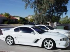 Here's some pictures of a white Saleen Mustang on white wheels.