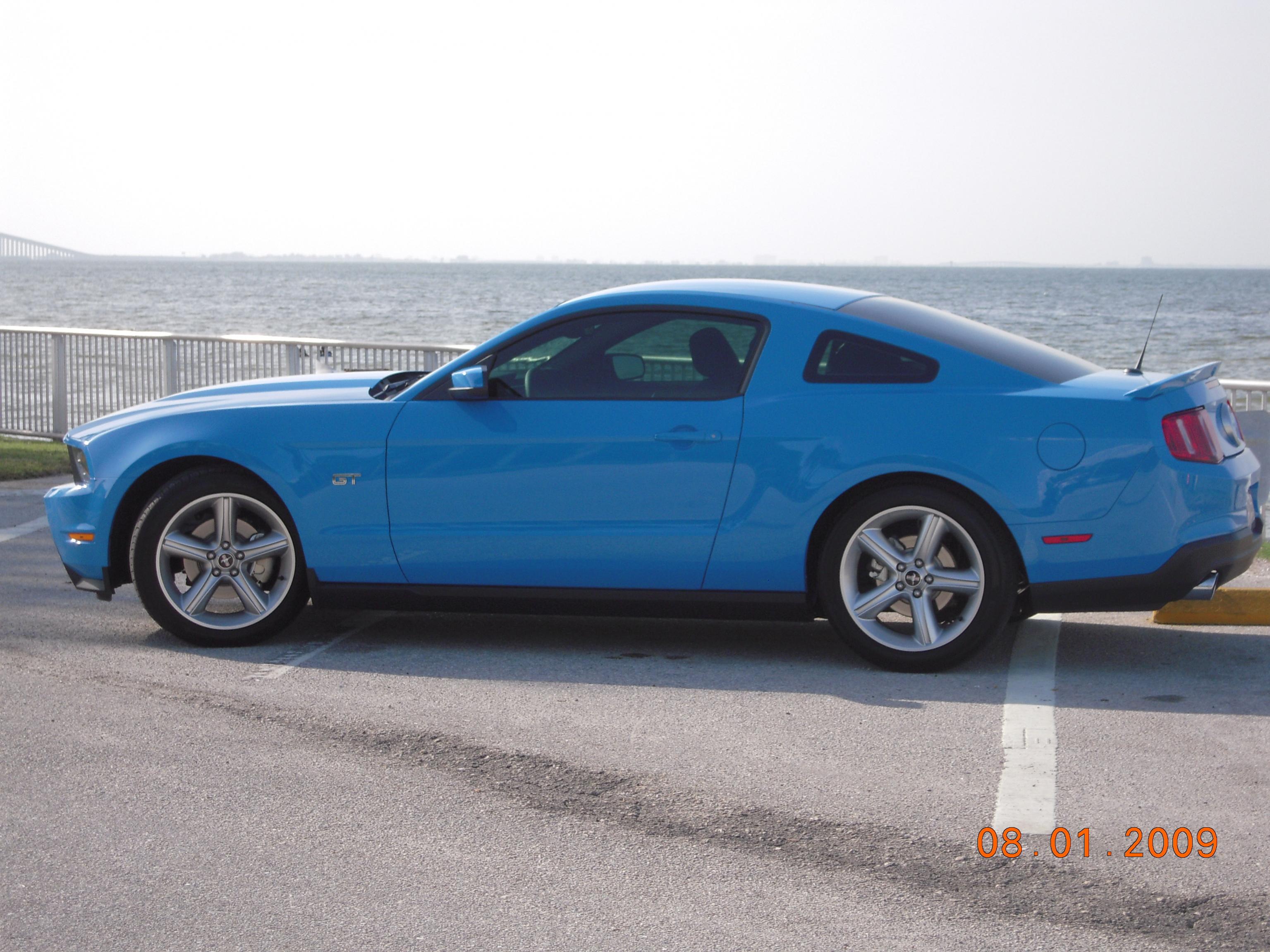 Not normally a fan of 20" wheels on a Mustang but that is pretty much exactly the look I was going for when I placed the order for the 2010 Grabber Blue GT... I was going to have my 18" Bullitts custom powedercoated satin black though, with no polished lip...