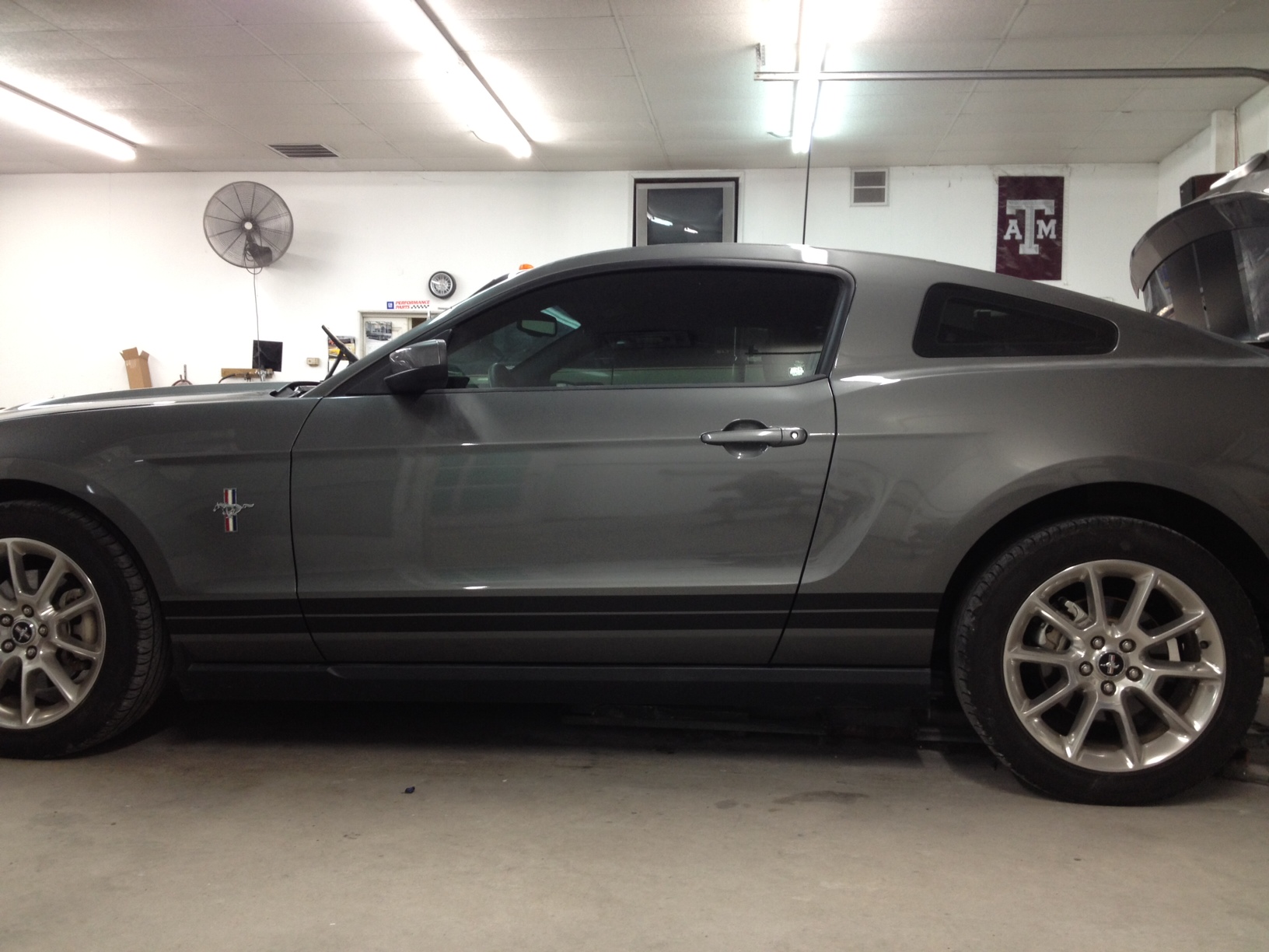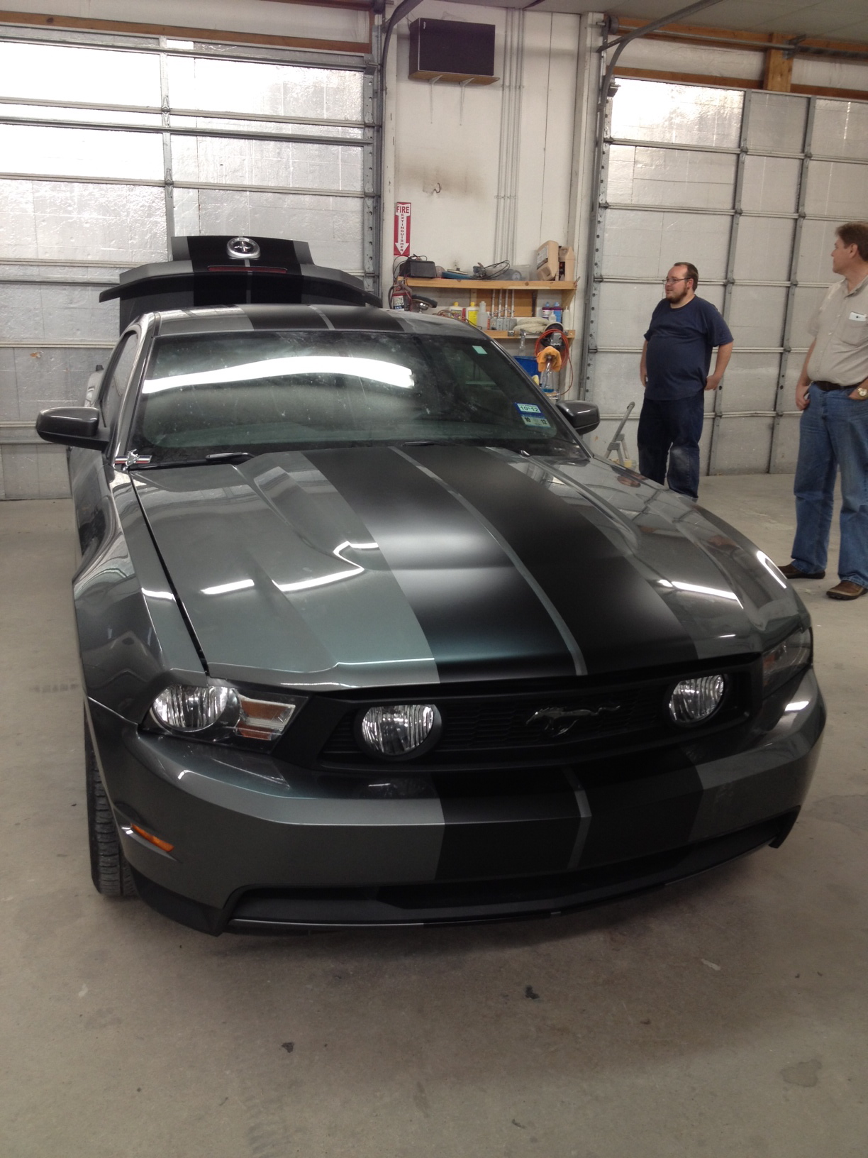 And because the accident was totally the other driver's fault, I don't have to come up with the deductible, which means essentially all I'm out to do all these changes is $70 for the GT grille surround! Anyway, here are some pics I took today of the car in the shop after the stripes had been painted on. Can't pick it up til tomorrow because the paint still needs more time to cure, but I am VERY pleased with the job he did!