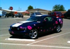 There's no writing, its like swirly lace crap, oh and don't forget the eye lashes on the headlights. Kinda hard to see in the photo. The driver is a girl either a teenager or in her early twenties, kinda doubt the breast cancer thing, but you never know.