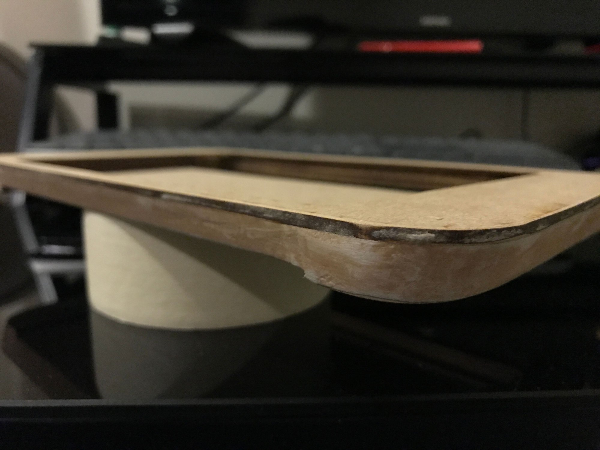 These were the pieces that resulted after a previous test I did on cardboard and some adjustments. The circular spots are just glue marks from the test fit. As you can see, I left some cutouts for neodinium magnets to hold it to the dashboard.