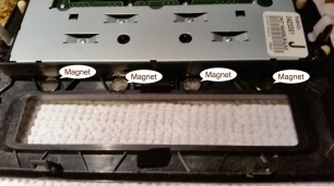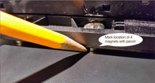 2) locate 4 spots to mount magnets on back of center console ( there are already 4 circles in the plastic below the opening for the LED display)