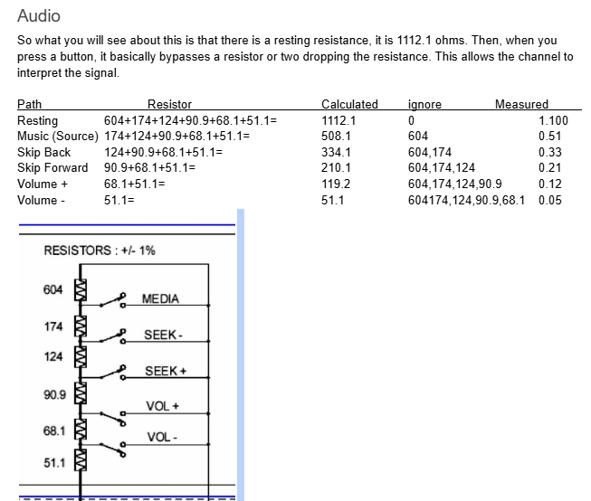 - phone buttons work, kinda. Seems like phone up and phone down have the same value as the other two (channel 3) so I will need to add another resistor there as well