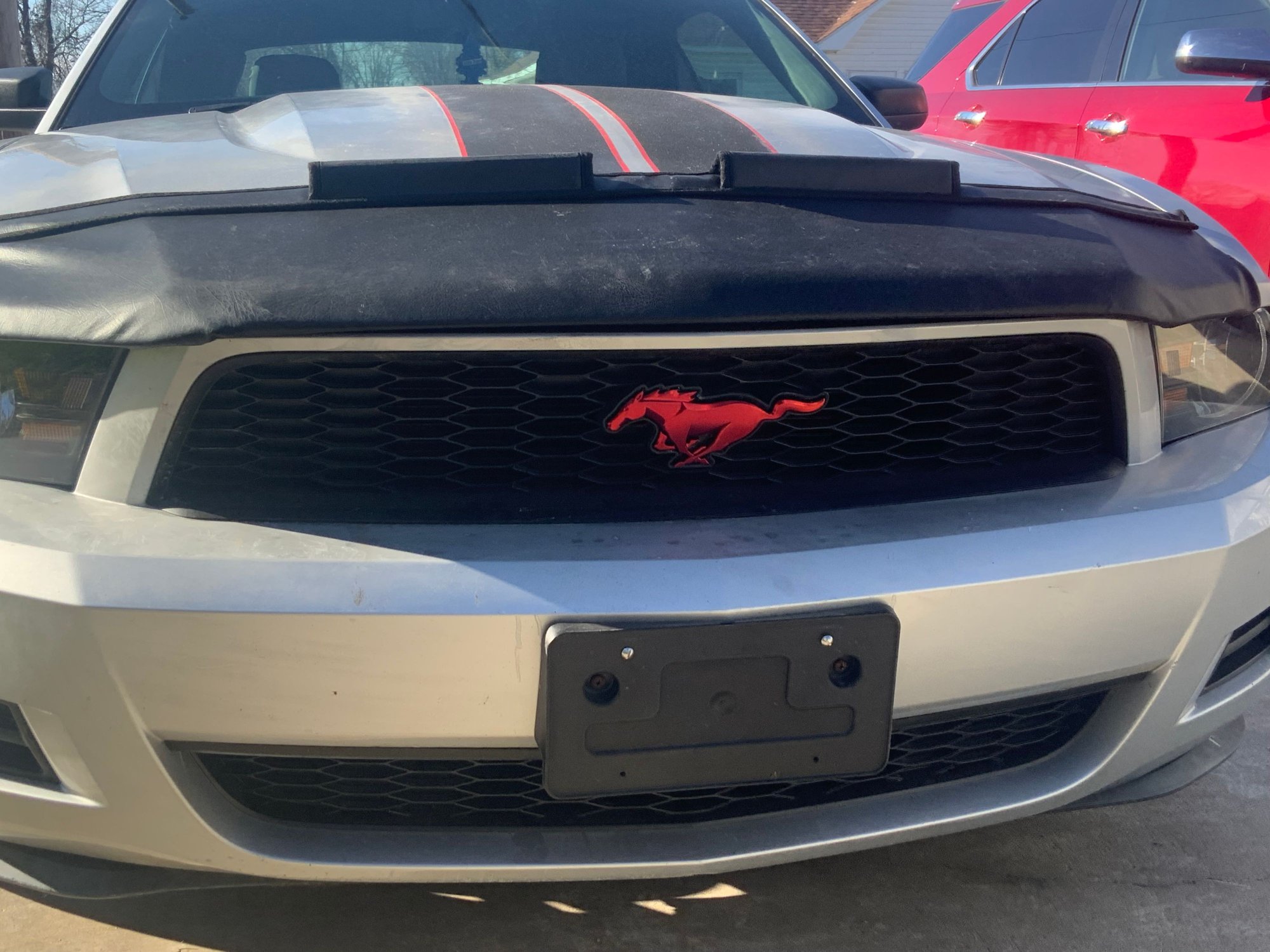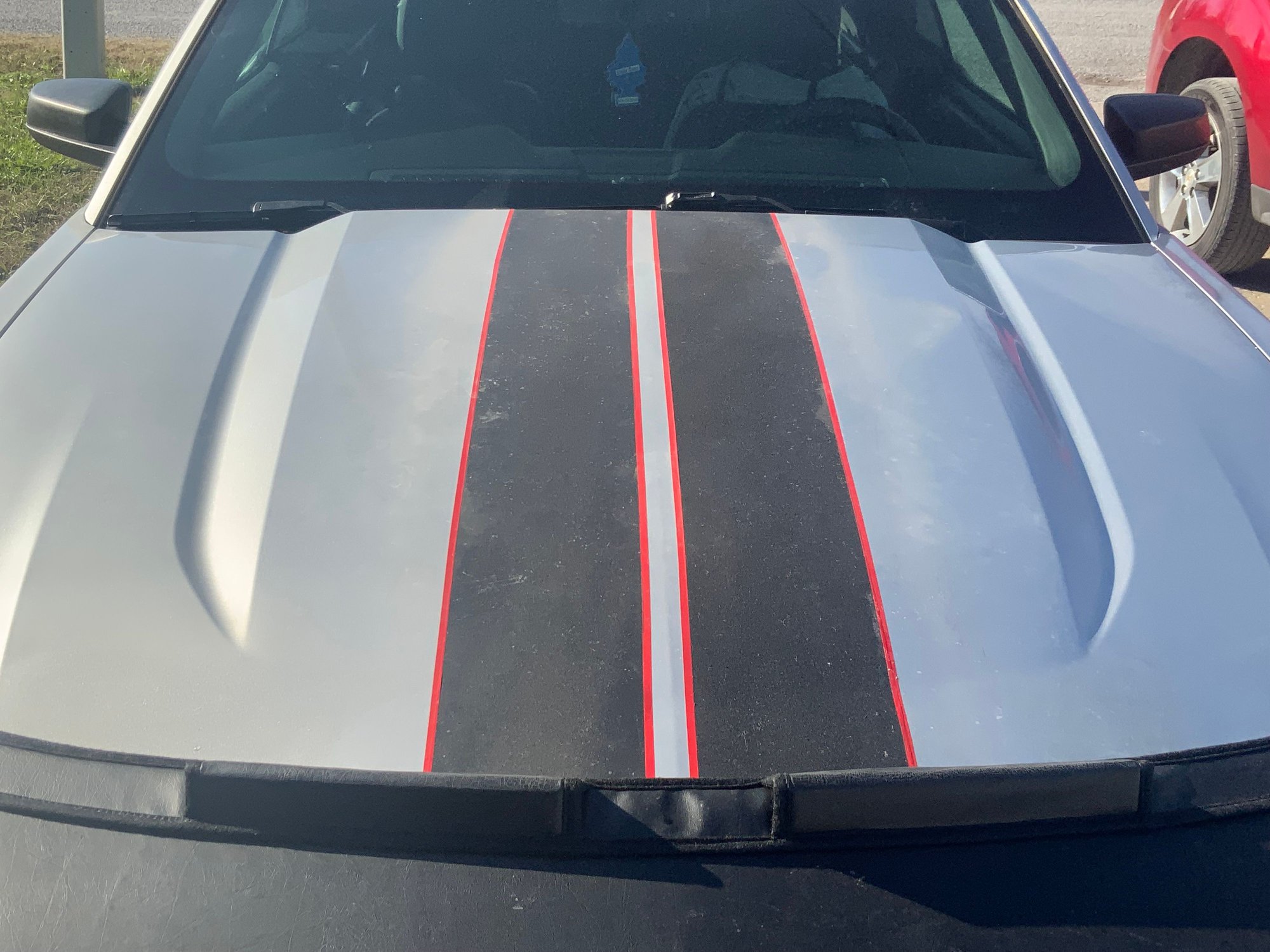 The poor mans racing stripes on the hood I did in plasti dip because I had a can my son left behind before he departed for the army. But I had to buy another can. I figured if it looked bad i would just peel it off, it is plasti dip after all. I have mixed feelings on this, it looks ok from afar off but the closer you get it has a strange texture to it and even looks wet still, but was sprayed in September. I got the pin striping from Auto Zone also. I might redo these next summer in paint. The bra hides someone’s poor job at body work.