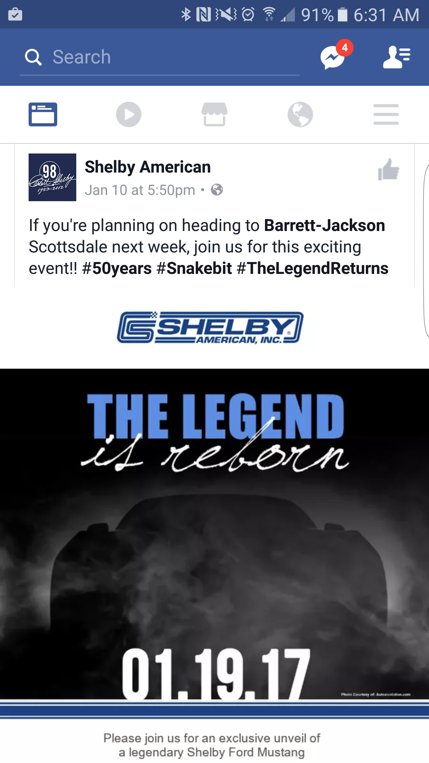Found this post on Facebook today regarding a reveal from Shelby at Barrett Jackson. I speculate that we will get our first look at the new GT500. It clearly says that it'll be a mustang and there is this tag, #50years. First GT500 came out 50 years ago. Thoughts?