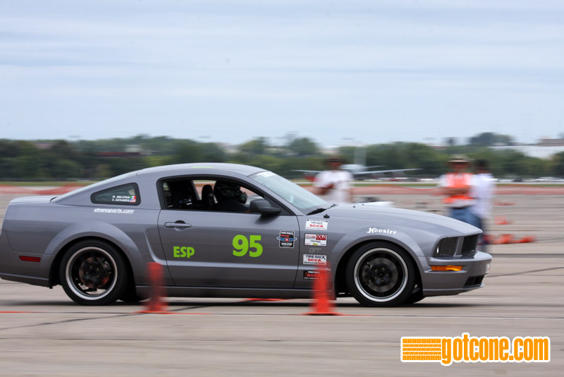 This is Sam's F-Stock 2011 GT which the rule limits wheel width to factory specs. There is a very small allowance for offsets (+/-10mm I believe), but that's it. Everyone tries to run the widest tire possible in Stock and Street Prepared classes. Sam actually won the 2010 SCCA Solo2 and Pro Solo FS National Championships on a smaller tire.